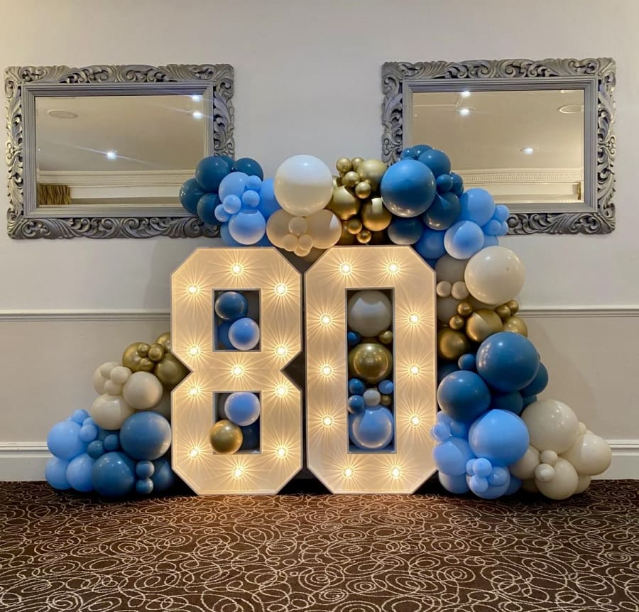 One days hire of 2 x 4ft light up numbers of your choice with balloons cascading around the numbers to give it a full look.