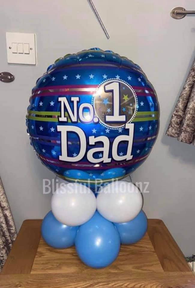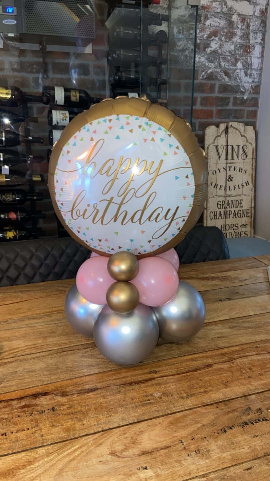 18' round foil balloon on top of a mini stack of latex balloons, with a little weight to secure the base.