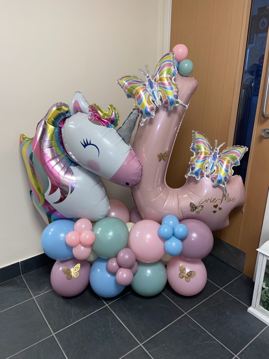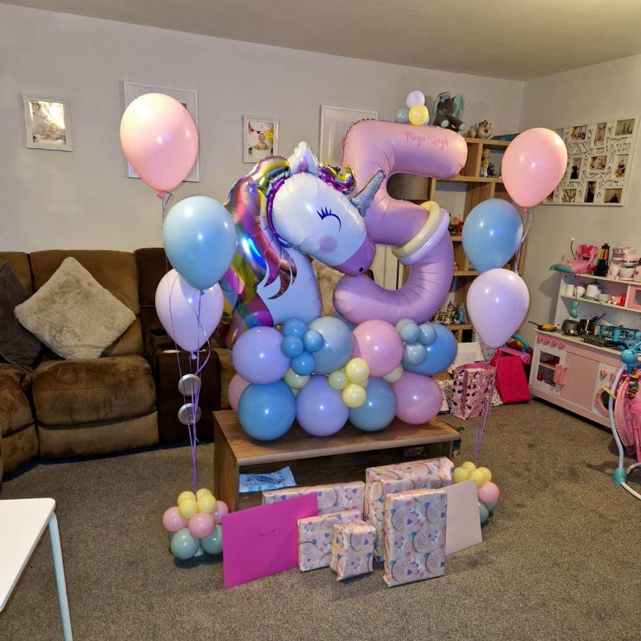 Air filled number and a large unicorn foil balloon on a bed of latex air filled balloons