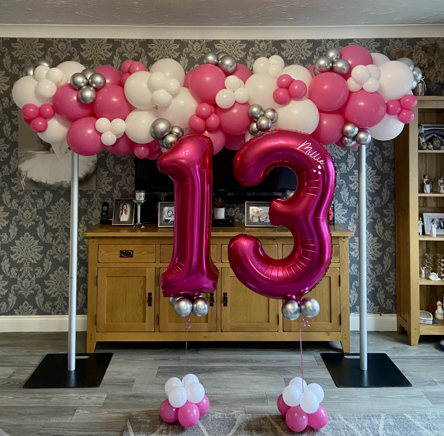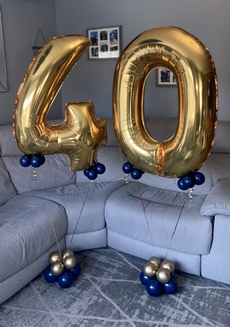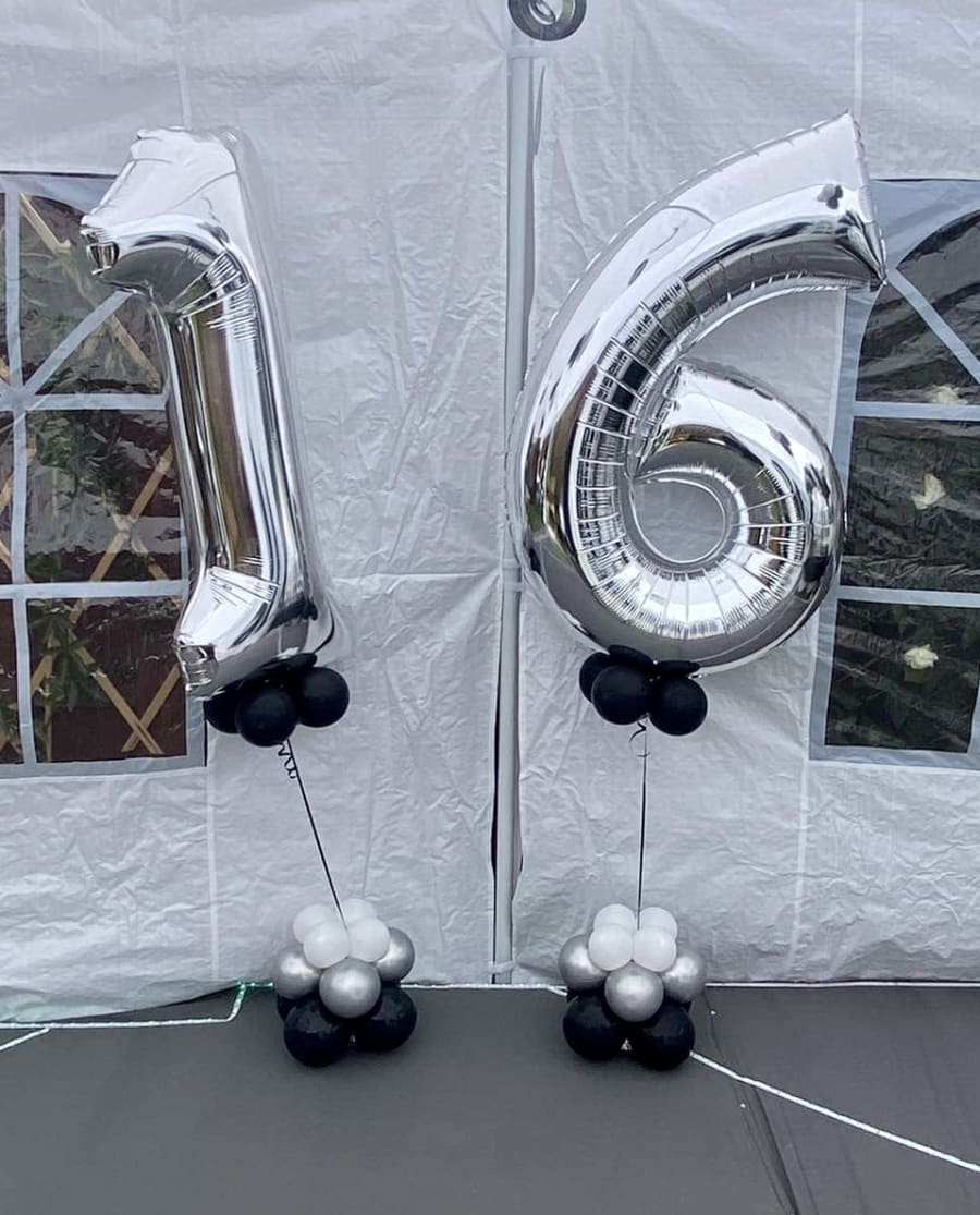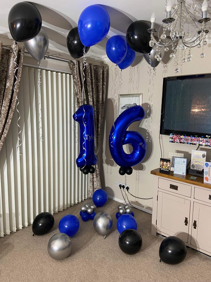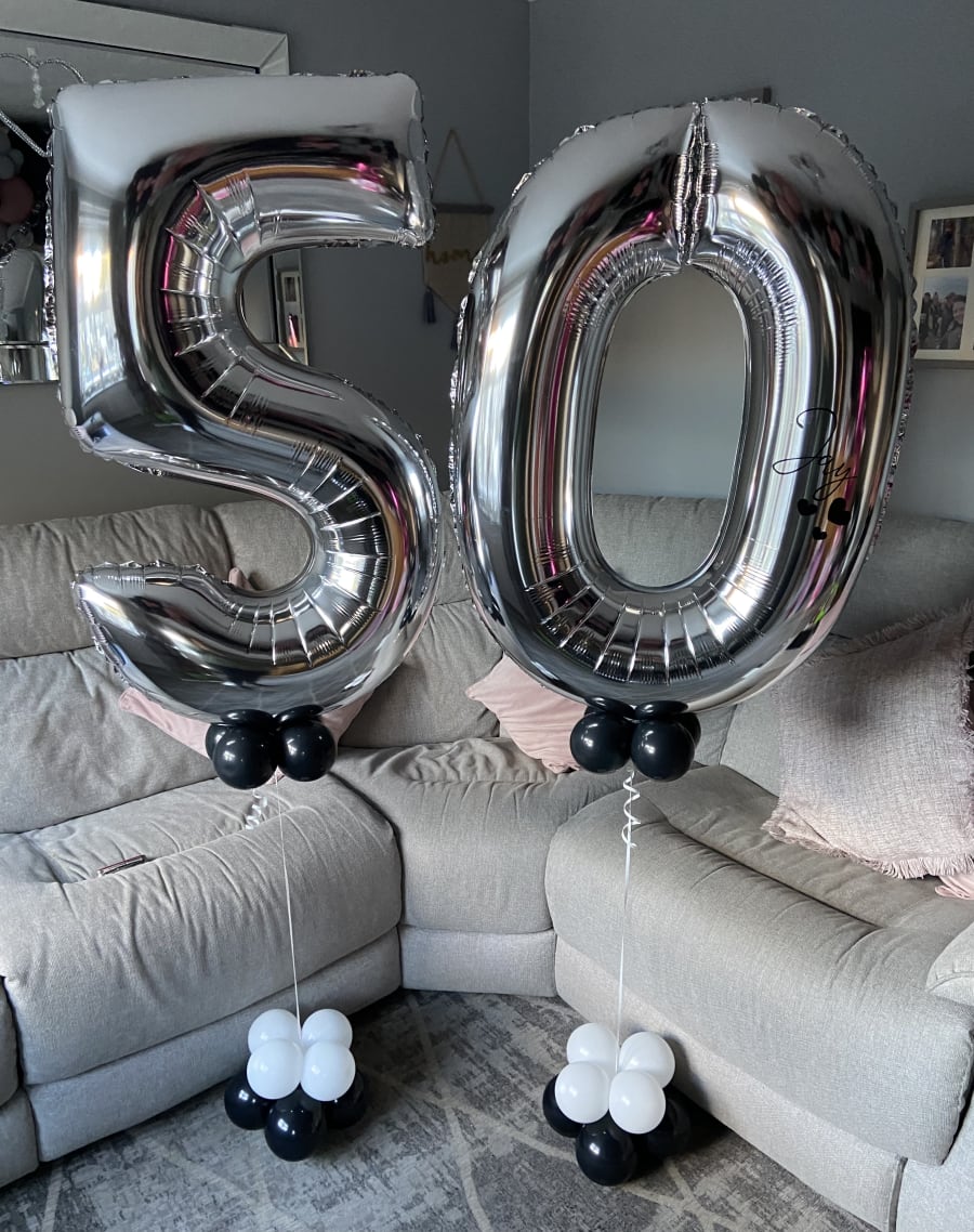 Helium filled numbers of your choice on a small weighted cluster of latex air filled balloons to give it that luxury look.