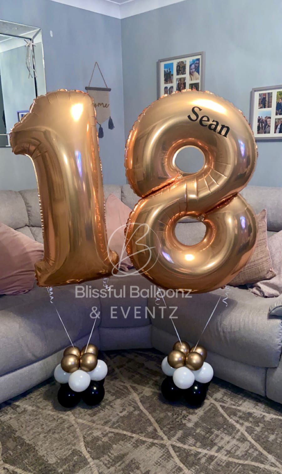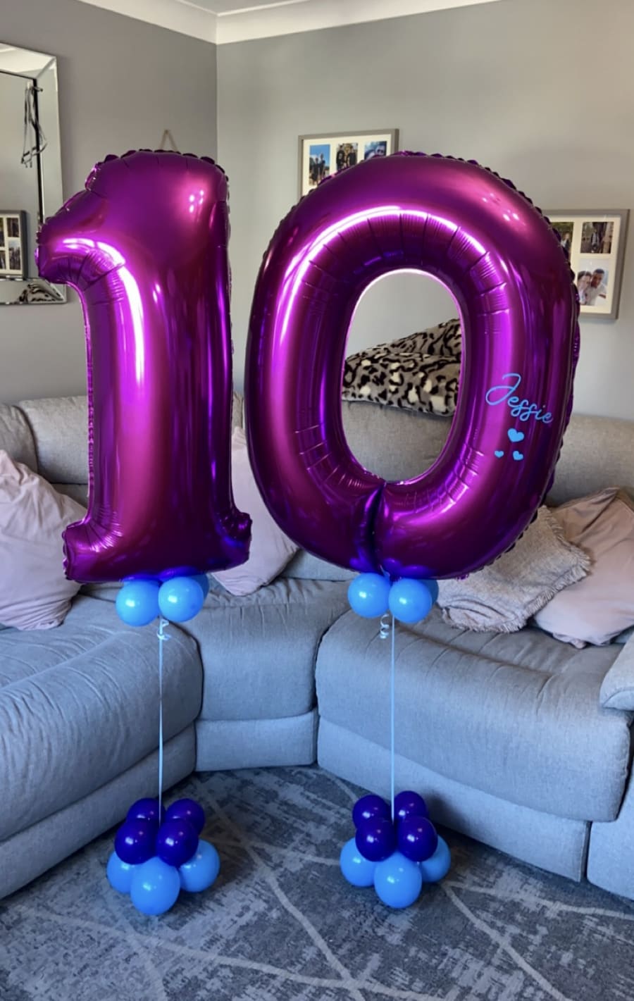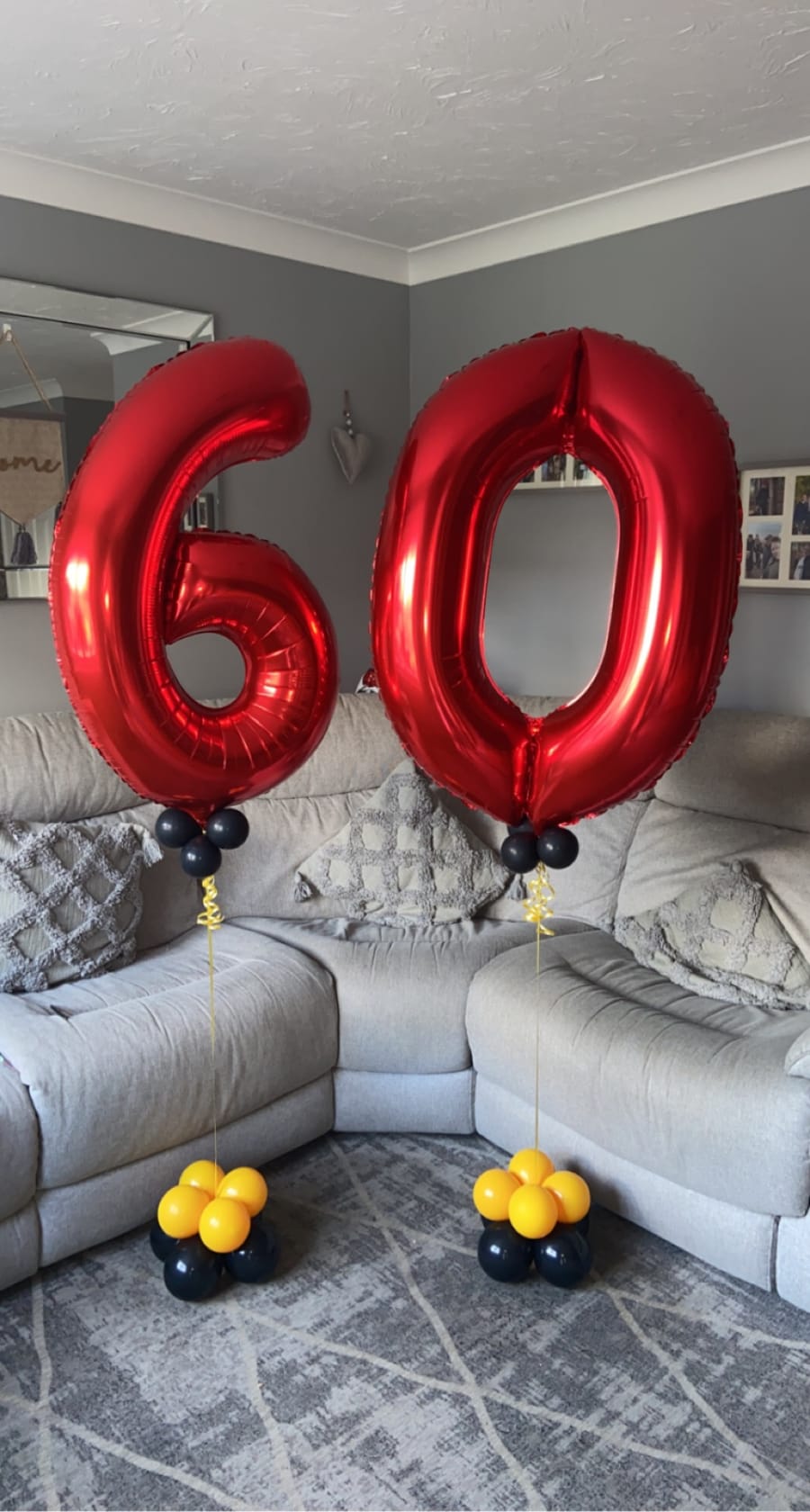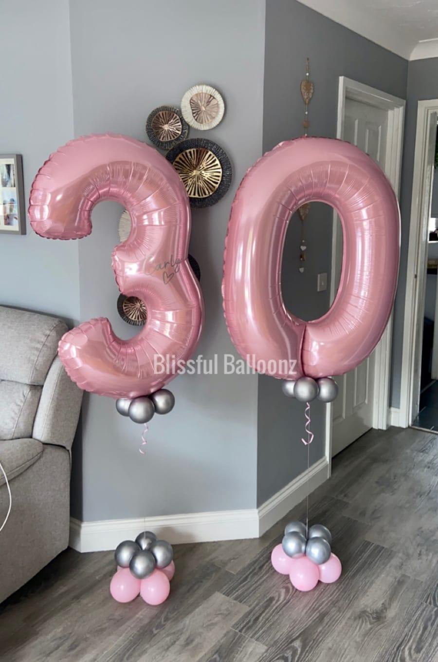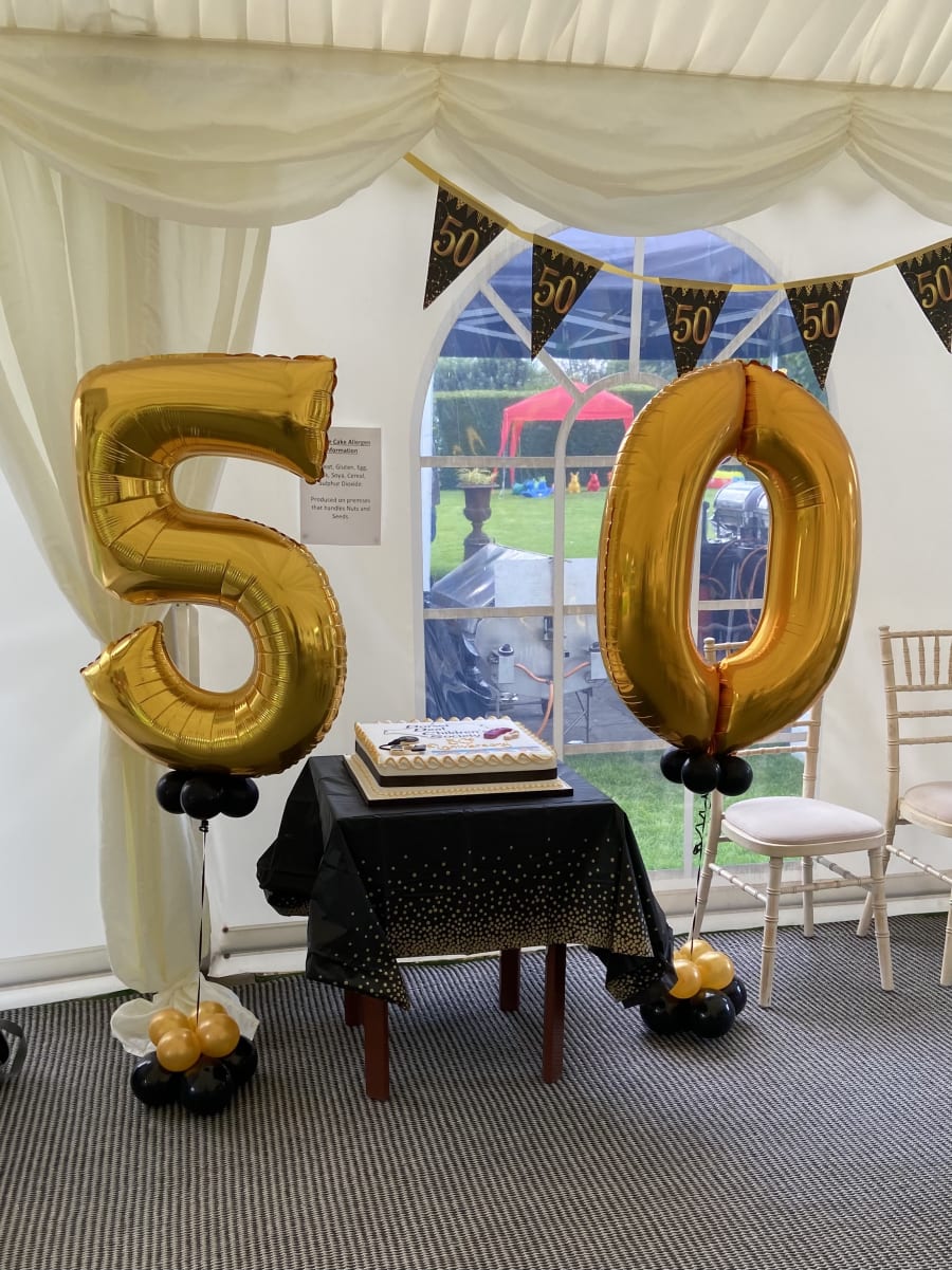 Helium filled numbers of your choice on a small weighted cluster of latex air filled balloons to give it that luxury look.