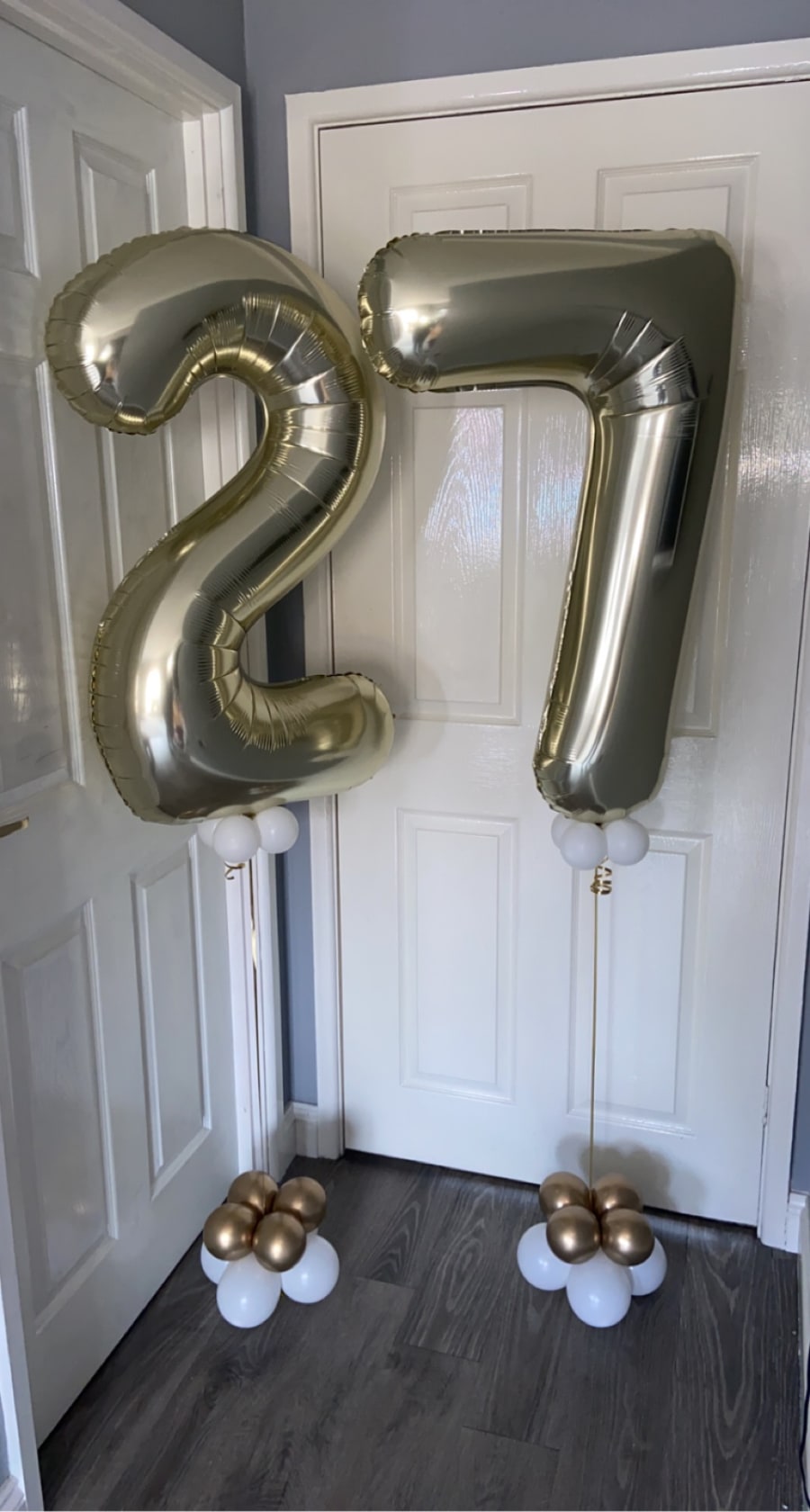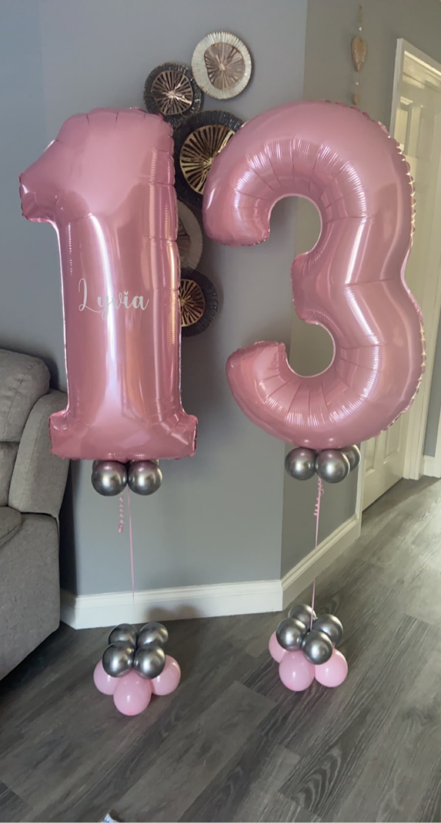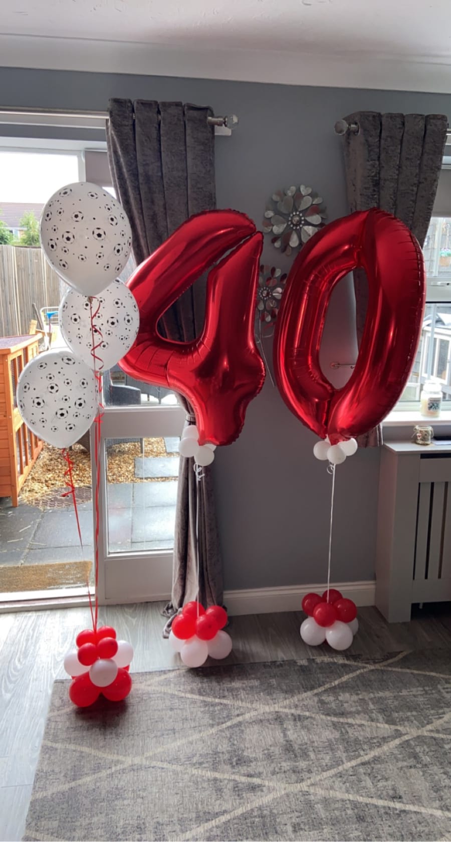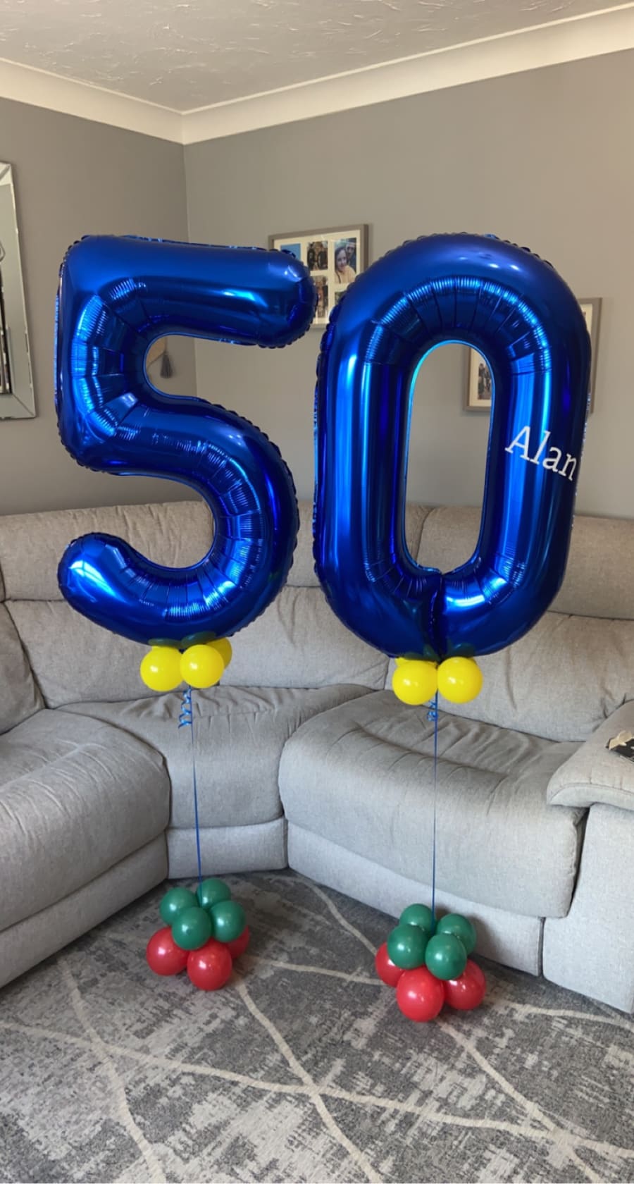 Helium filled numbers of your choice on a small weighted cluster of latex air filled balloons to give it that luxury look.