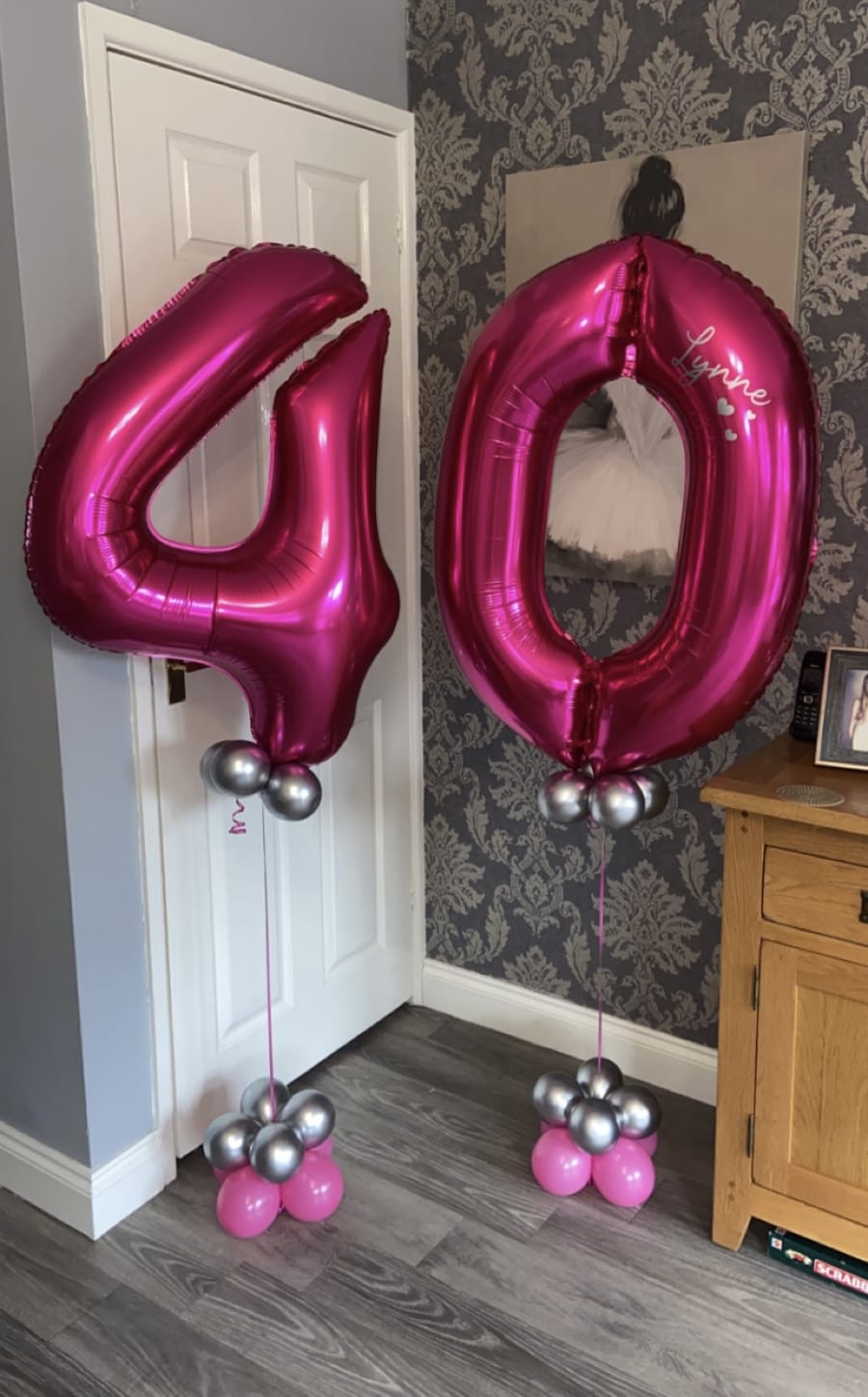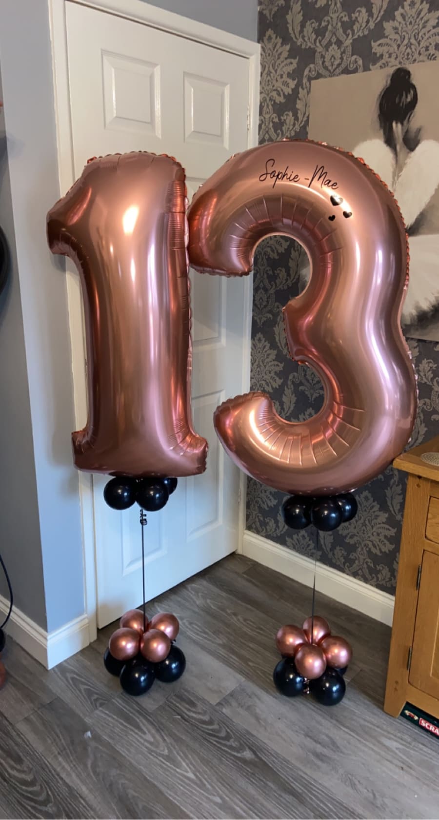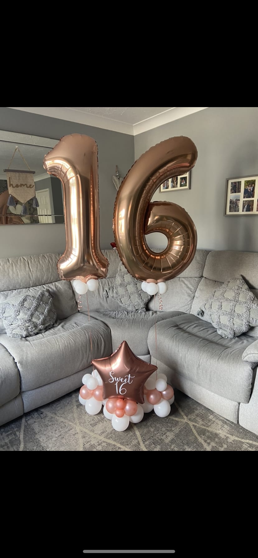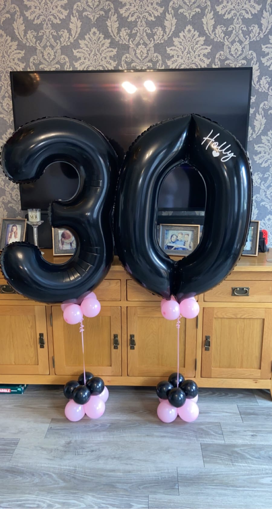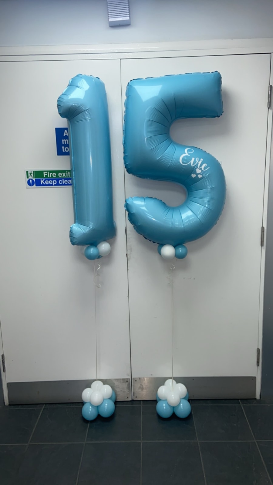 Helium filled numbers of your choice on a small weighted cluster of latex air filled balloons to give it that luxury look.