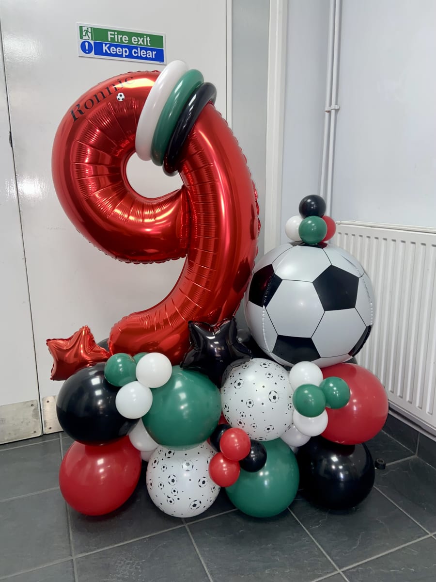 Air filled number and a football orbz foil balloon on a bed of latex air filled balloons