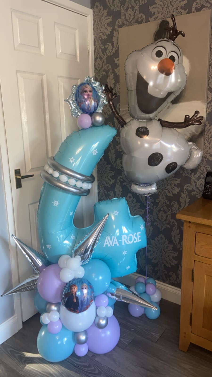 Helium filled Olaf balloon on a small weighted cluster of latex air filled balloons to give it that luxury look. Can be changed to other characters.