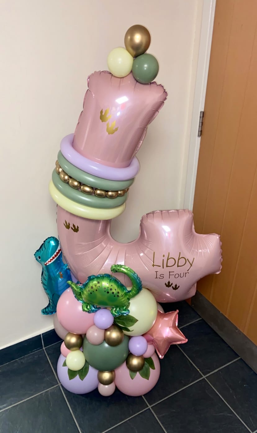 Air filled number of your choice on a stack of latex air filled balloons with added character foils (designs may vary)