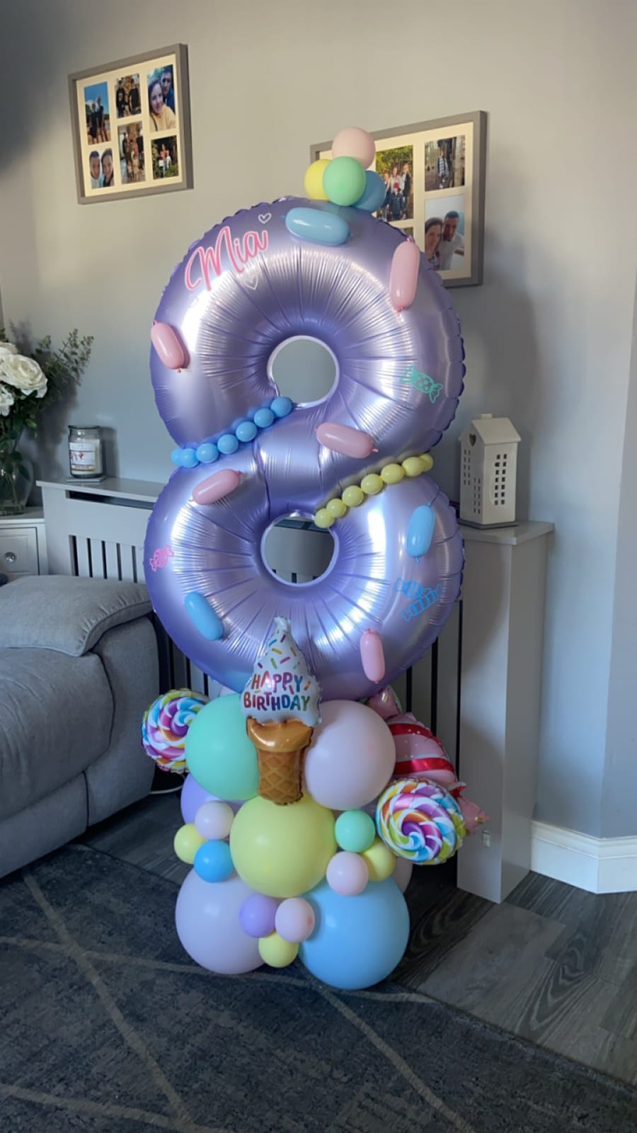 Air filled number of your choice on a stack of latex air filled balloons with added balloon sprinkles and mini theme related foils.