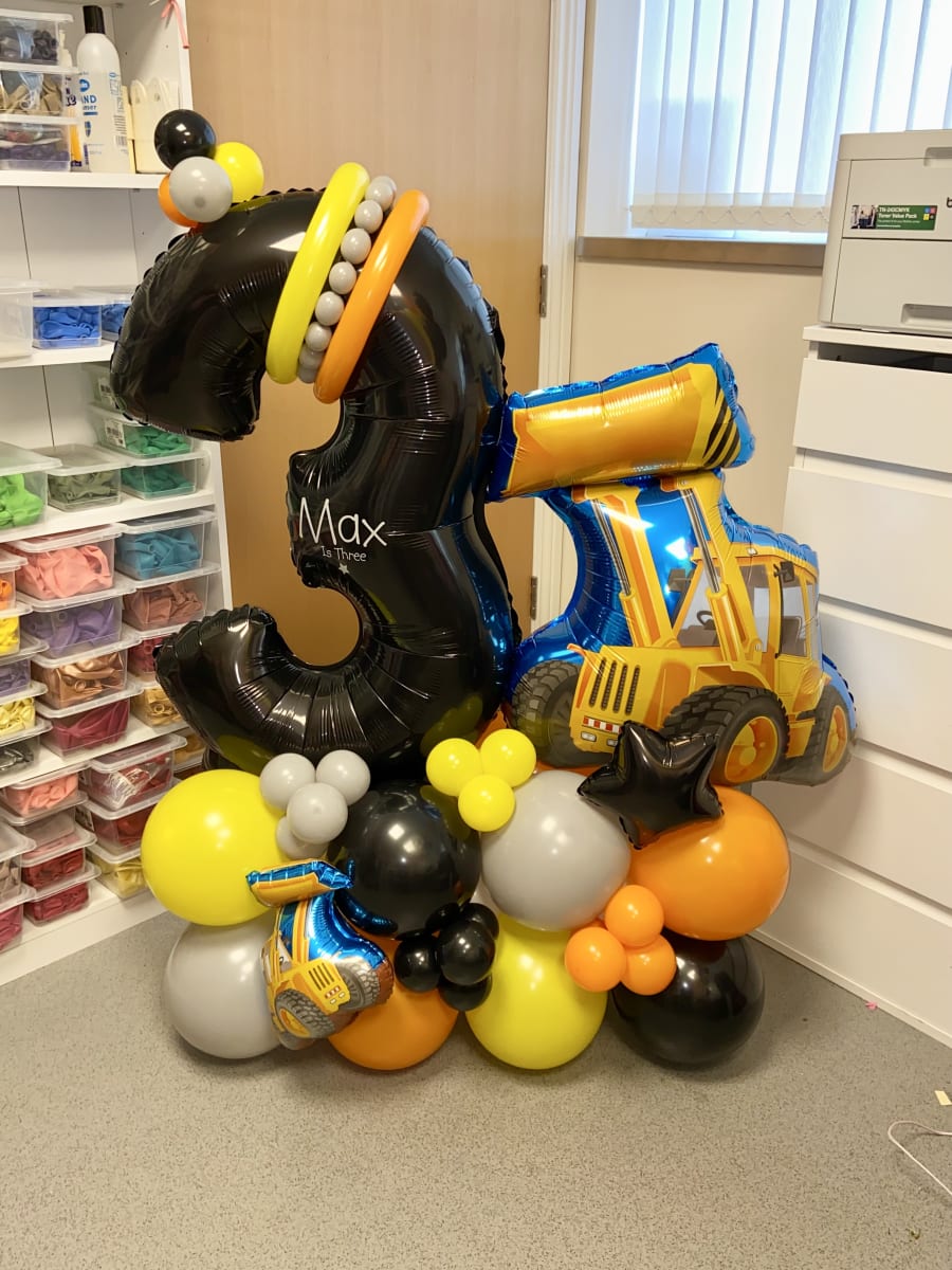 Air filled number and a large digger foil balloon on a bed of latex air filled balloons
