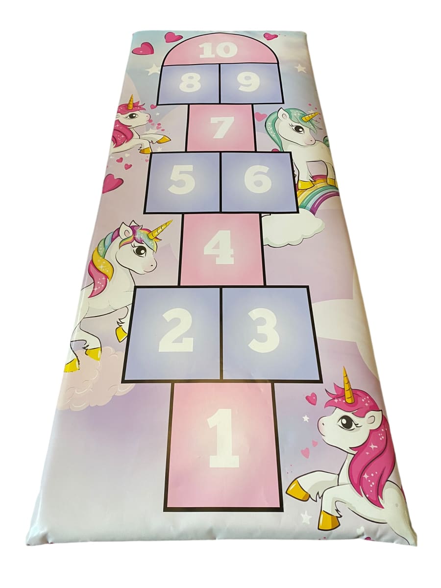 Ignite imagination and encourage active play at your child's next celebration with our enchanting Unicorn Themed Hopscotch. Perfectly designed for birthday parties, this vibrant and whimsical hopscotch mat brings a sprinkle of magic wherever it's placed. Measuring approximately 5ft high by 2ft wide, this mat offers plenty of space for little feet to hop, skip, and jump with joy.