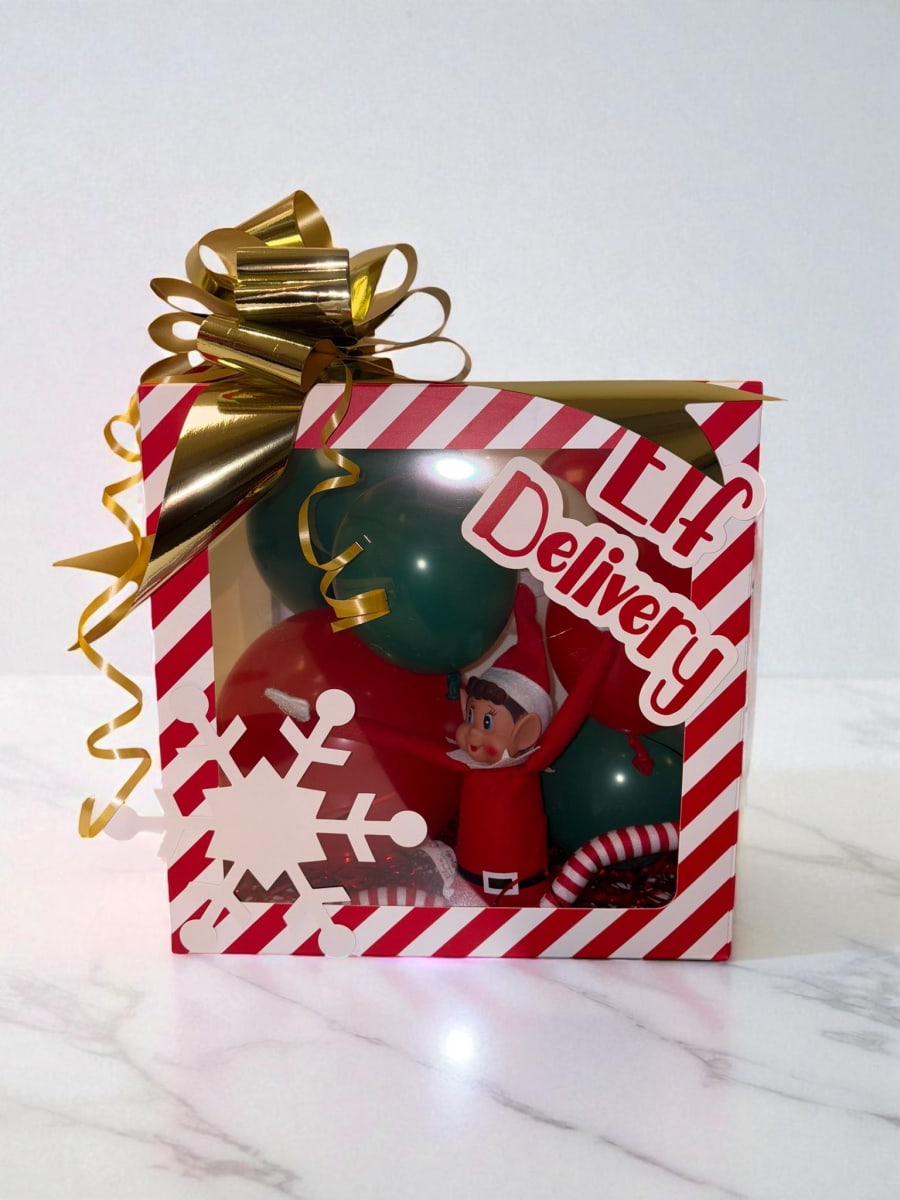 Simply place your elf inside the box, arrange the balloons inside and place the bow back on. Watch kids’ faces light up when they discover their new holiday friend. 🎄