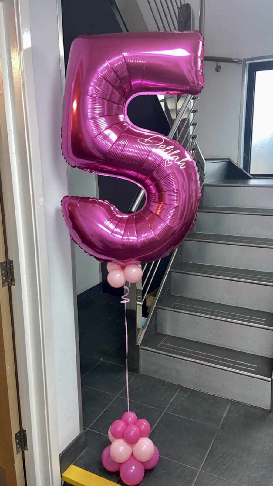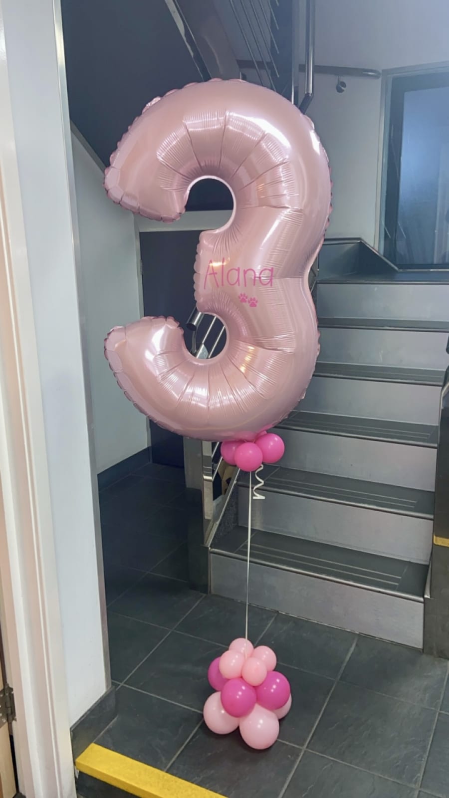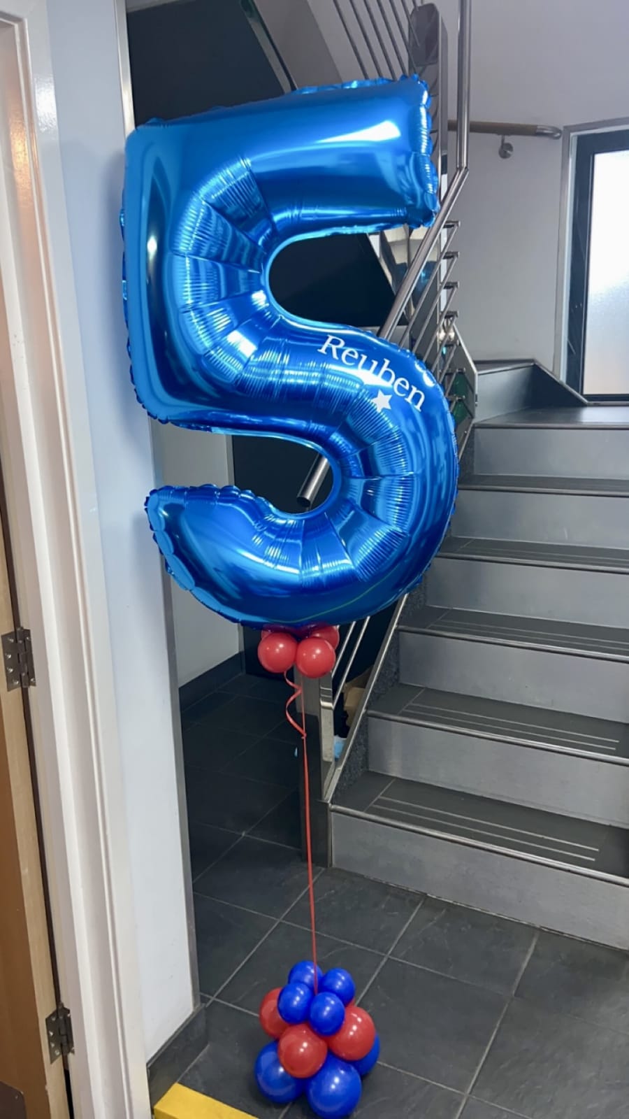 Helium filled number of your choice on a weighted cluster of latex air filled balloons to give it that luxury look.