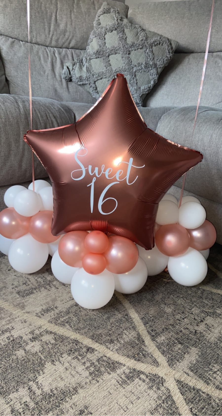 18' round foil balloon on top of a mini stack of latex balloons, with a little weight to secure the base.