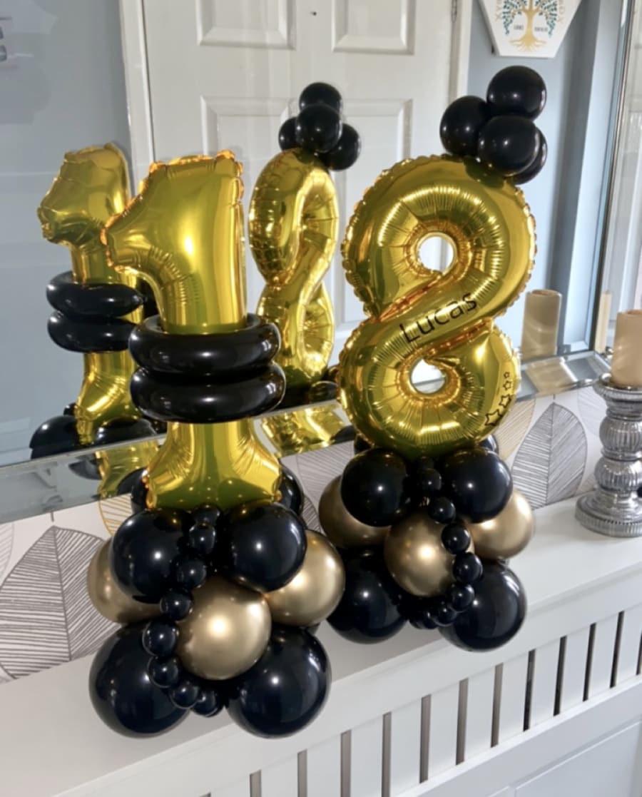 16' number foil balloons on top of a mini stack of latex balloons, with a weight to secure the base.