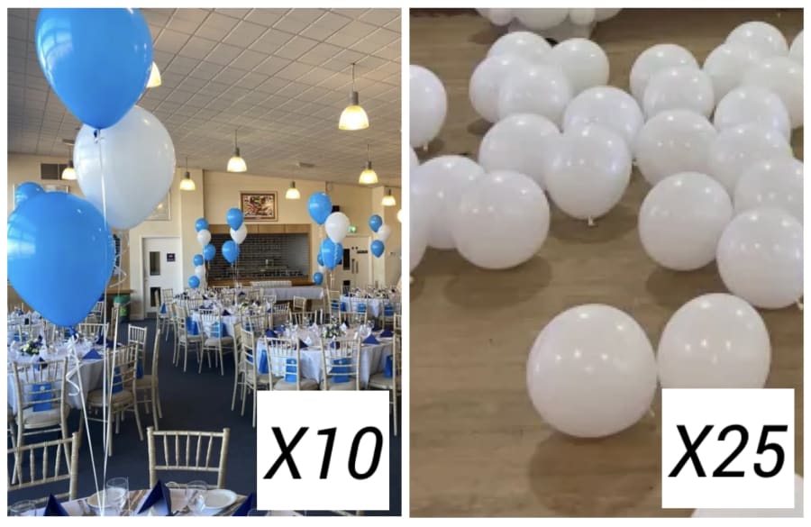 - 10x helium bouquets , these can all be for tables or floor standing or a mix of both, please advise in the additional notes section at checkout, (if no preference is given they will be automatically made for table height)