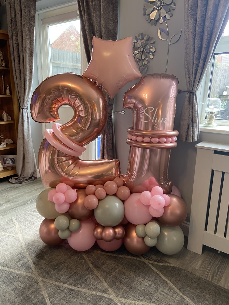 40”'' air filled numbers of your choice on a bed of latex air filled balloons.