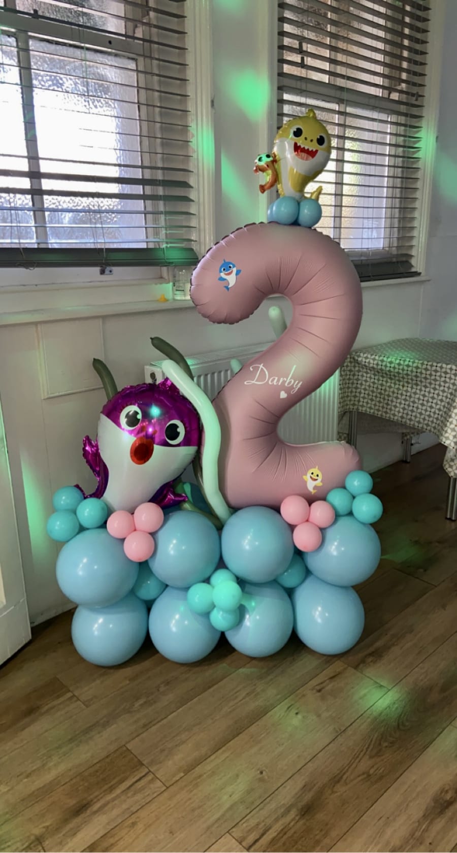 Air filled number and a large Baby shark foil balloon on a bed of latex air filled balloons