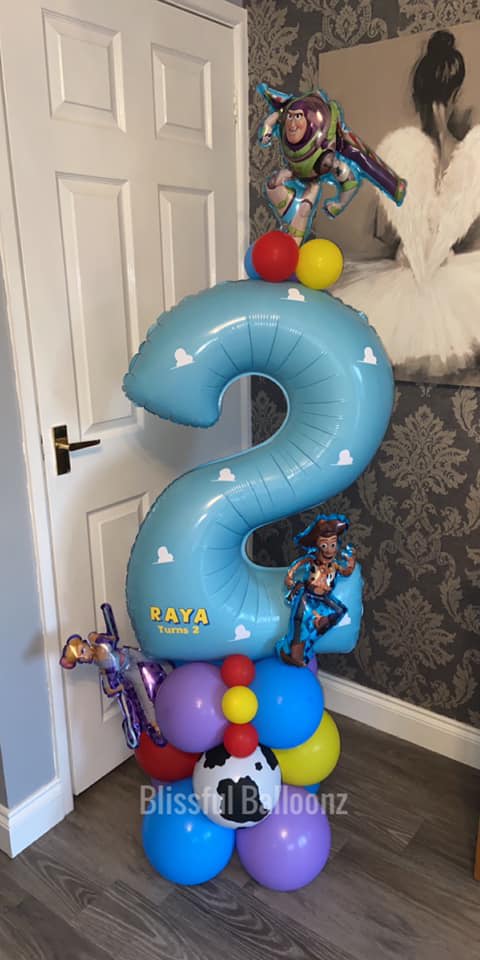 Air filled number of your choice on a stack of latex air filled balloons with added character foils & vinyl stickers on the number balloon