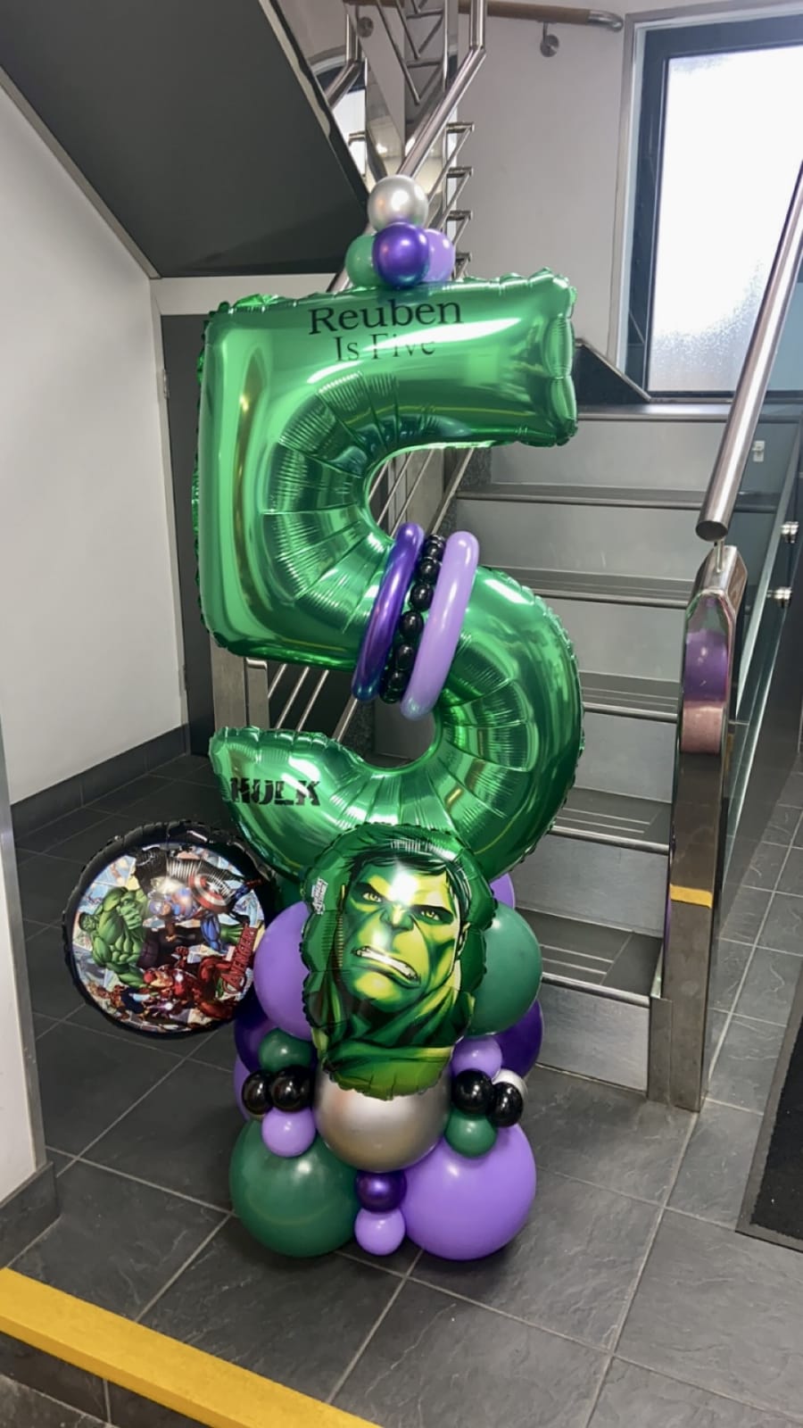 Air filled number of your choice on a stack of latex air filled balloons with added character foils (designs may vary)