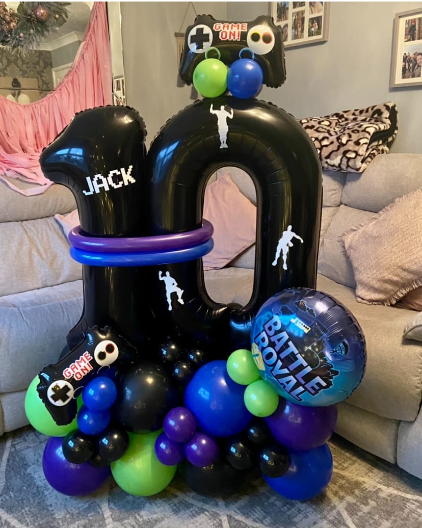 Air filled number and a Fortnite foil balloons on a bed of latex air filled balloons