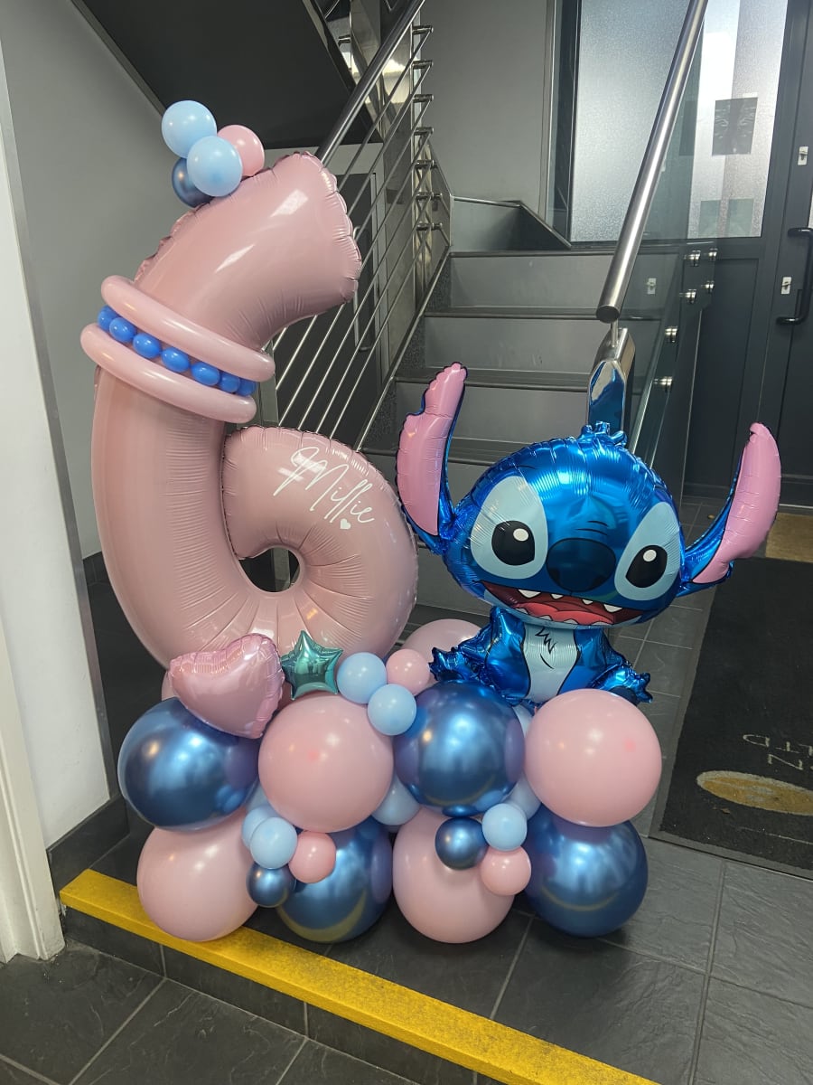 Air filled number and a stitch foil balloon on a bed of latex air filled balloons