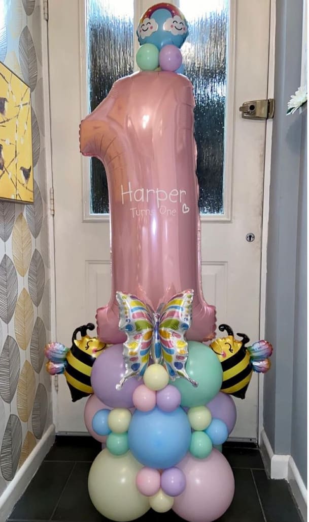 Air filled number of your choice on a stack of latex air filled balloons with added mini character foil balloons and decor. (Designs may vary)