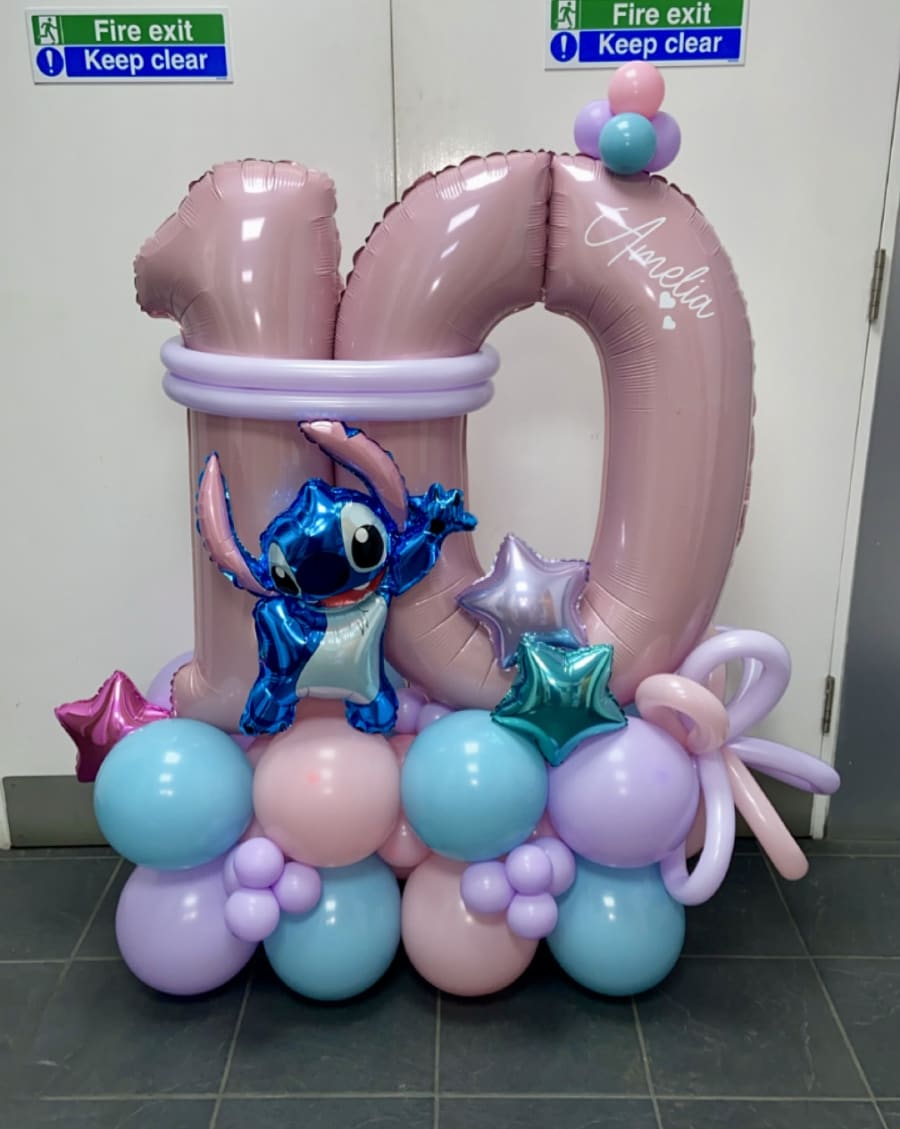 Air filled numbers and a stitch foil balloon on a bed of latex air filled balloons