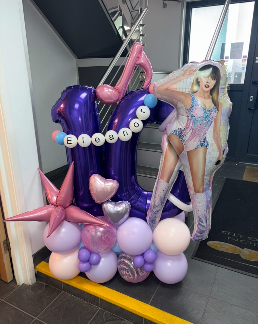 Air filled numbers and a Taylor Swift foil balloon on a bed of latex air filled balloons