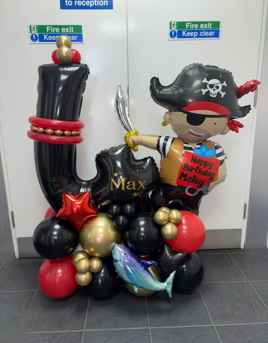 Air filled number and a large pirate foil balloon on a bed of latex air filled balloons