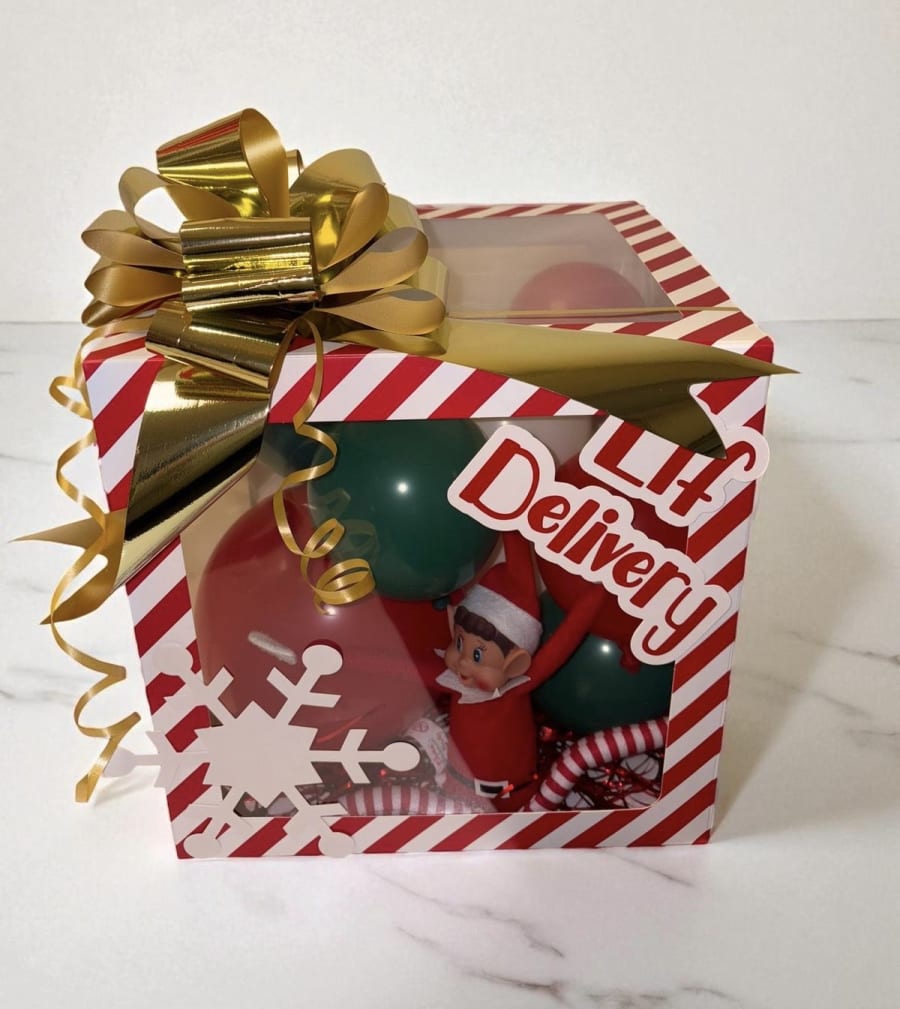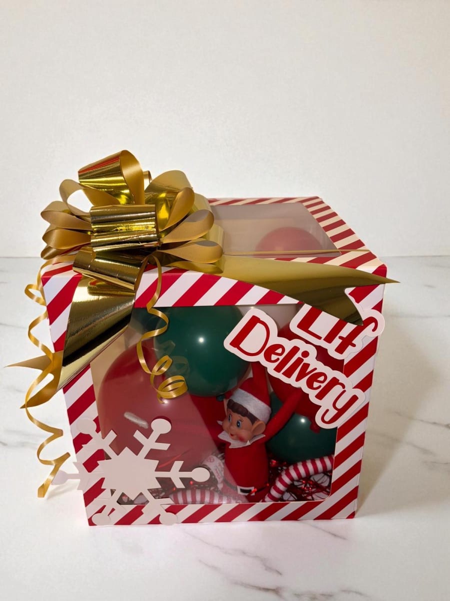 The Elf arrival box is a special delivery from the North Pole. Wrapped in a swirl of red and green balloons and crowned with a dazzling gold bow, this cheeky little elf arrives like a VIP. Perfect for starting the Christmas countdown.