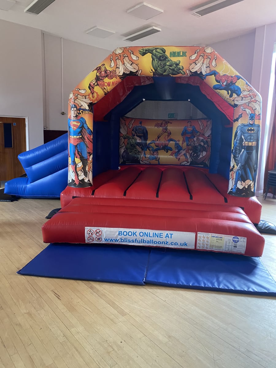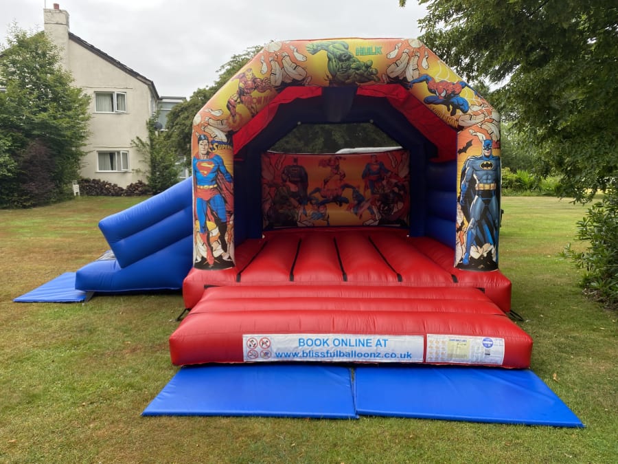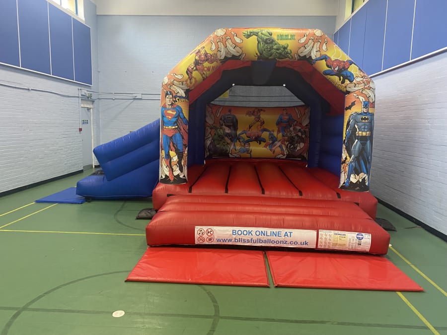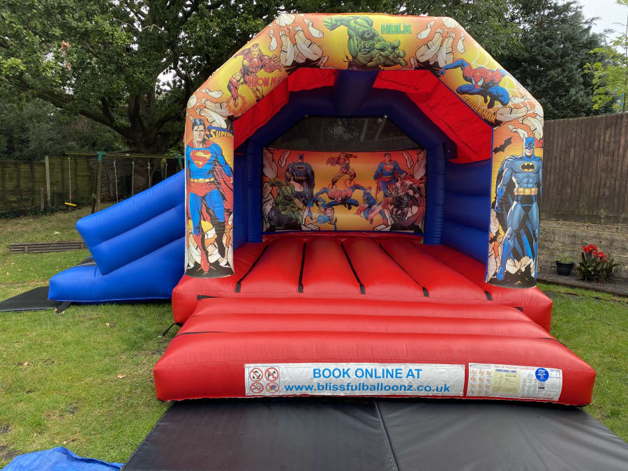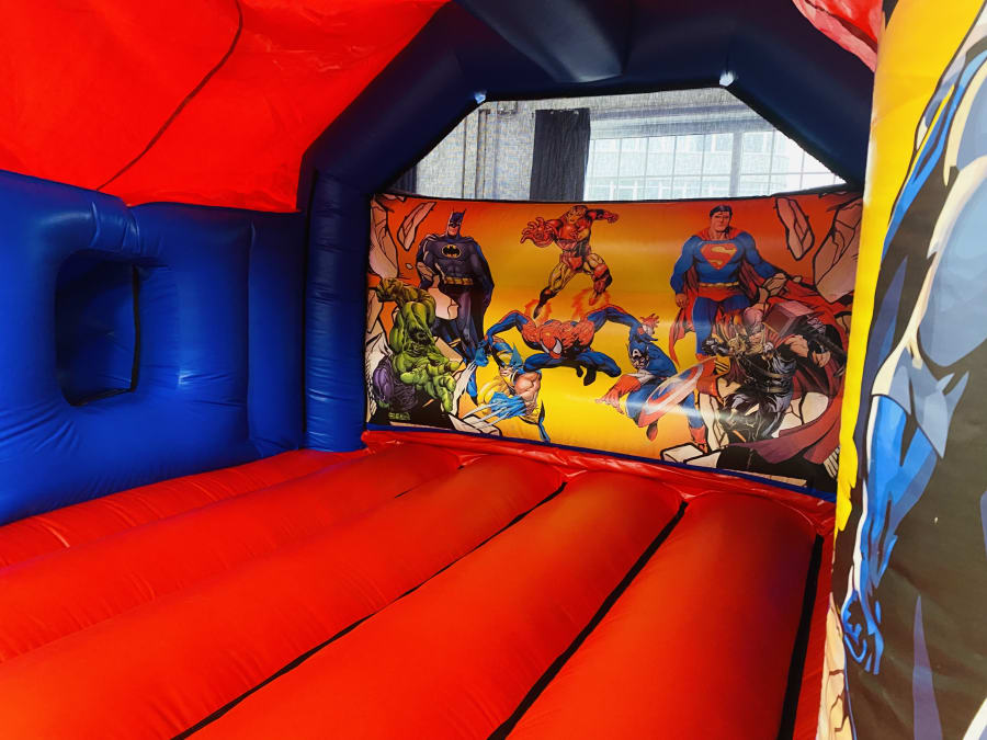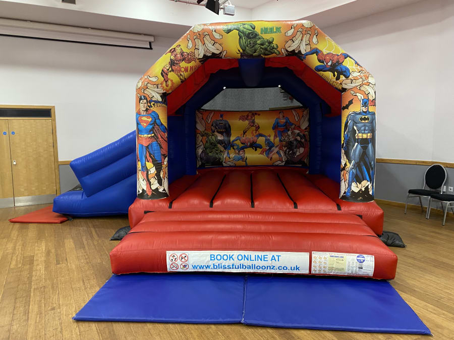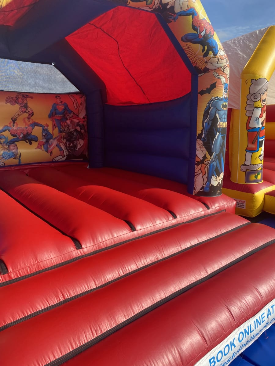 Bring Adventure to Your Event with Our Super Hero Themed Bouncy Castle with Slide