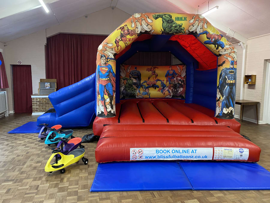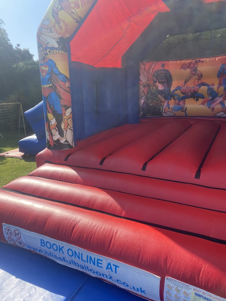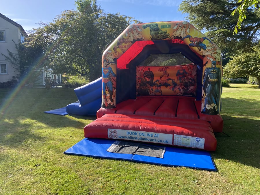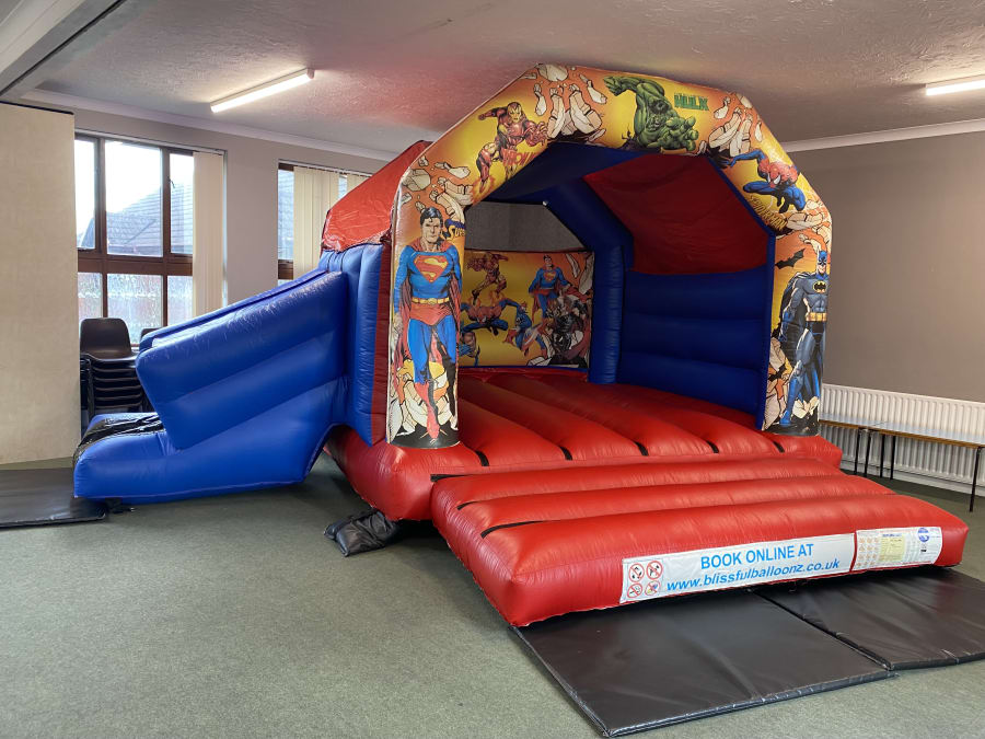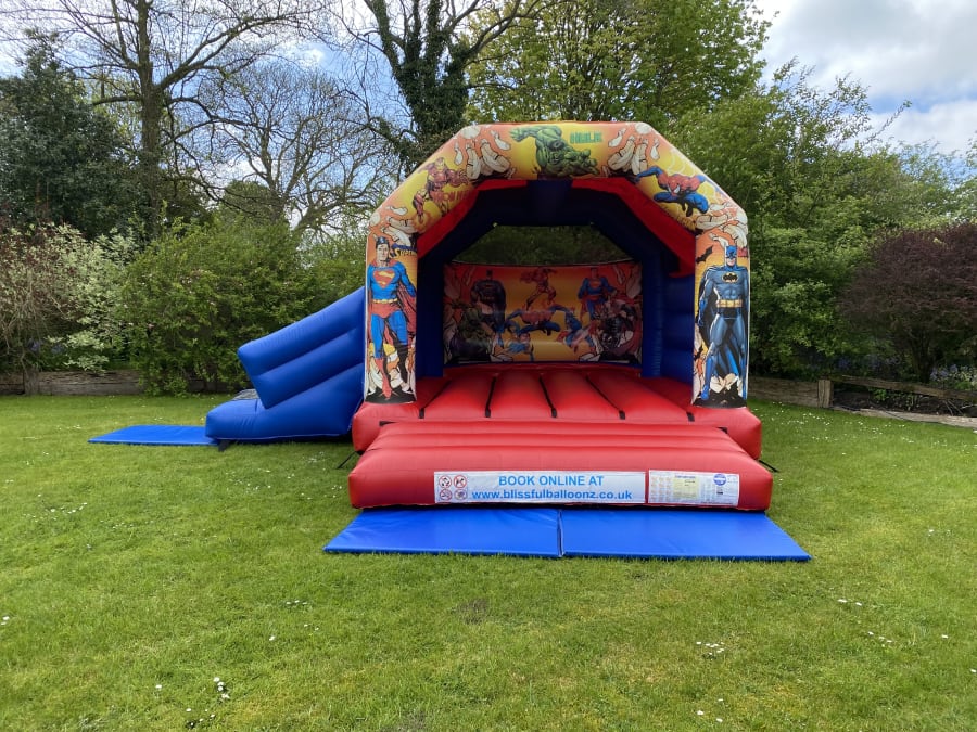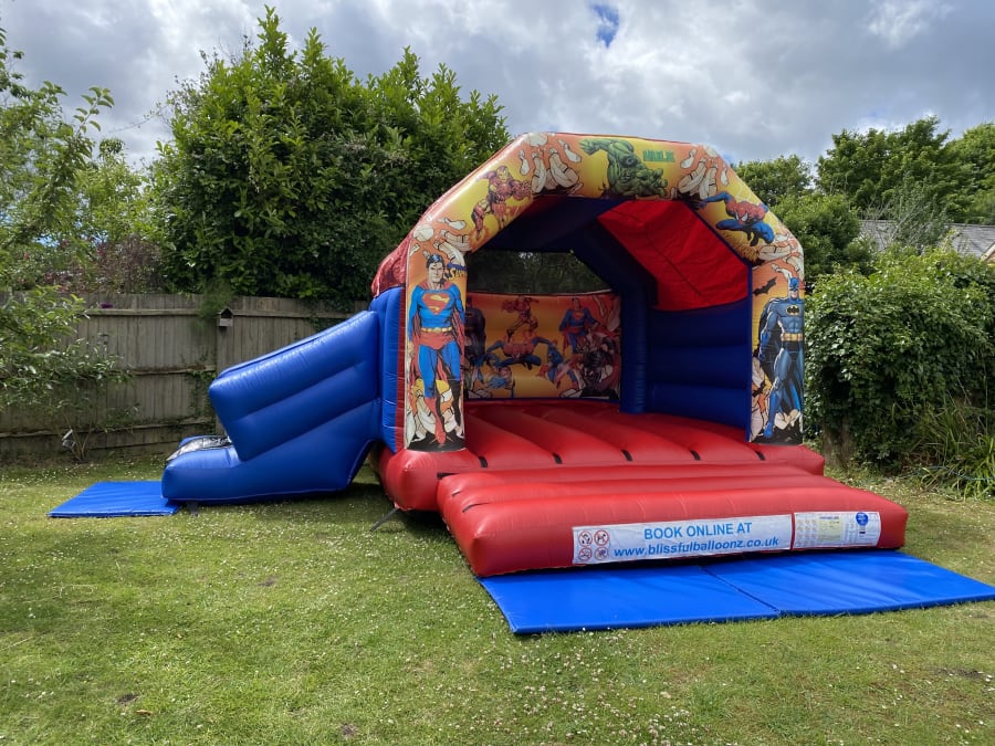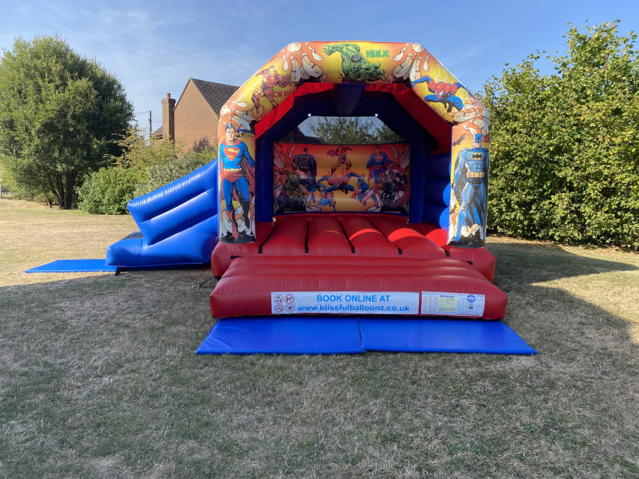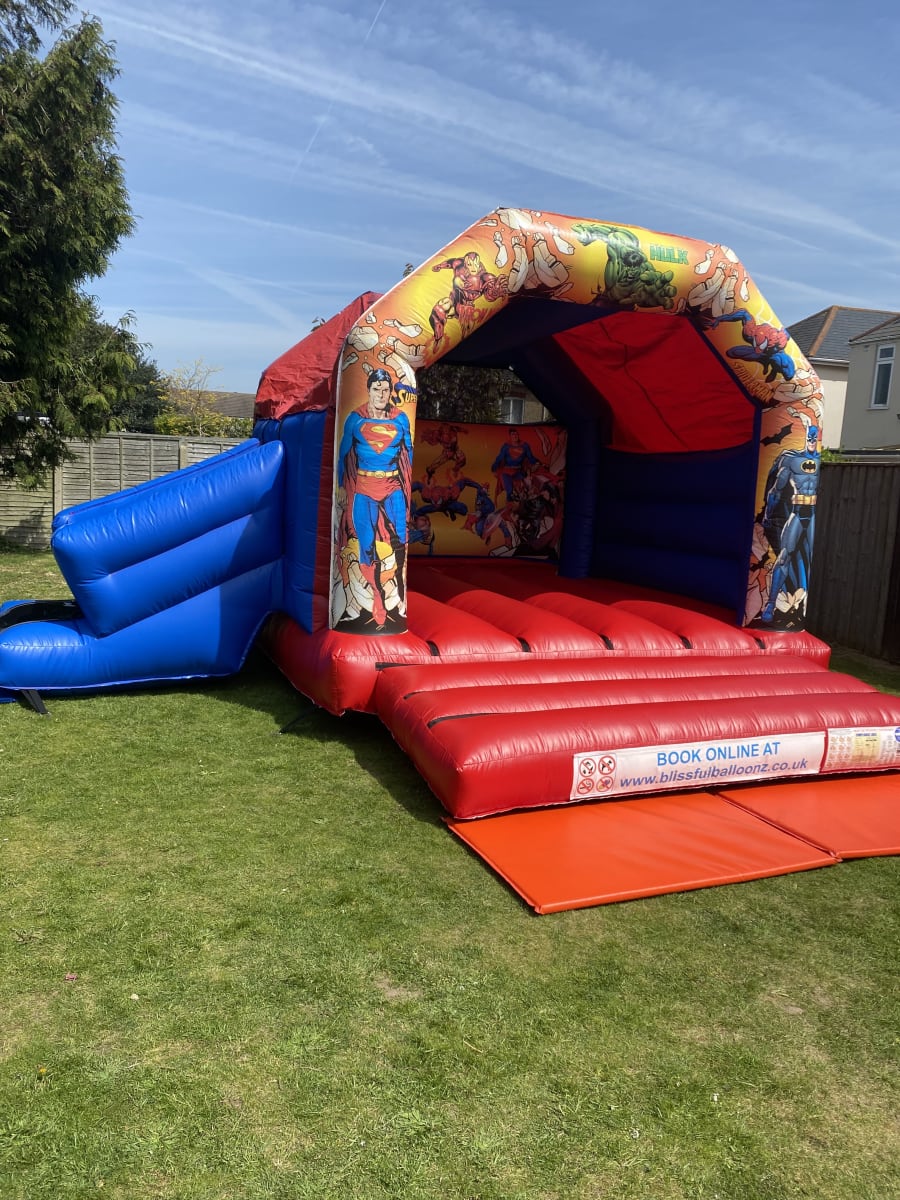 Bring Adventure to Your Event with Our Super Hero Themed Bouncy Castle with Slide
