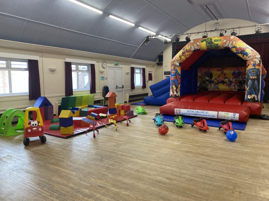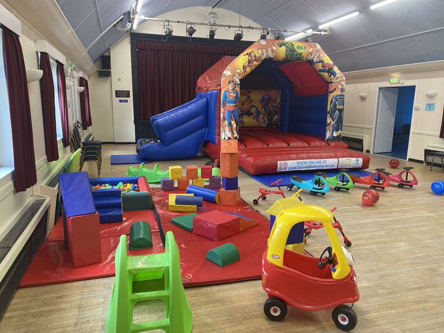 Broadstone War Memorial Hall has a very nice sized hall with a full kitchen and plenty of on site parking available, the hall can easily accommodate a bouncy castle soft play package and a large photo backdrop sailboard balloon display for your party or celebration.
