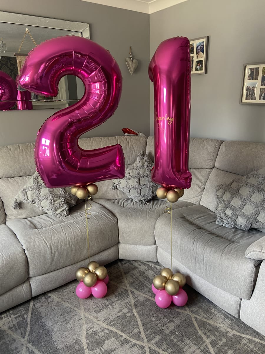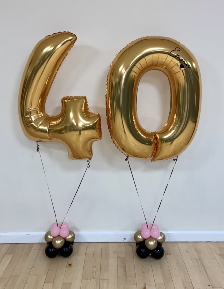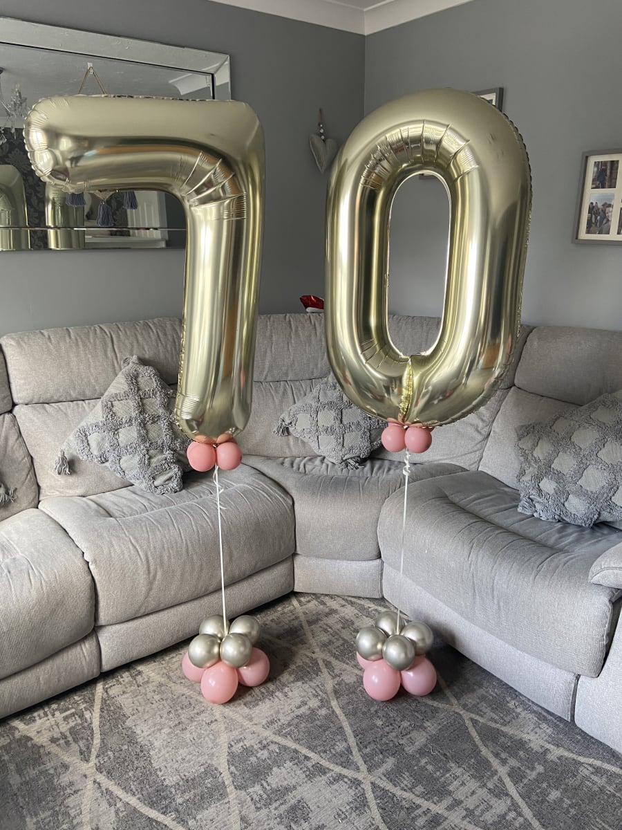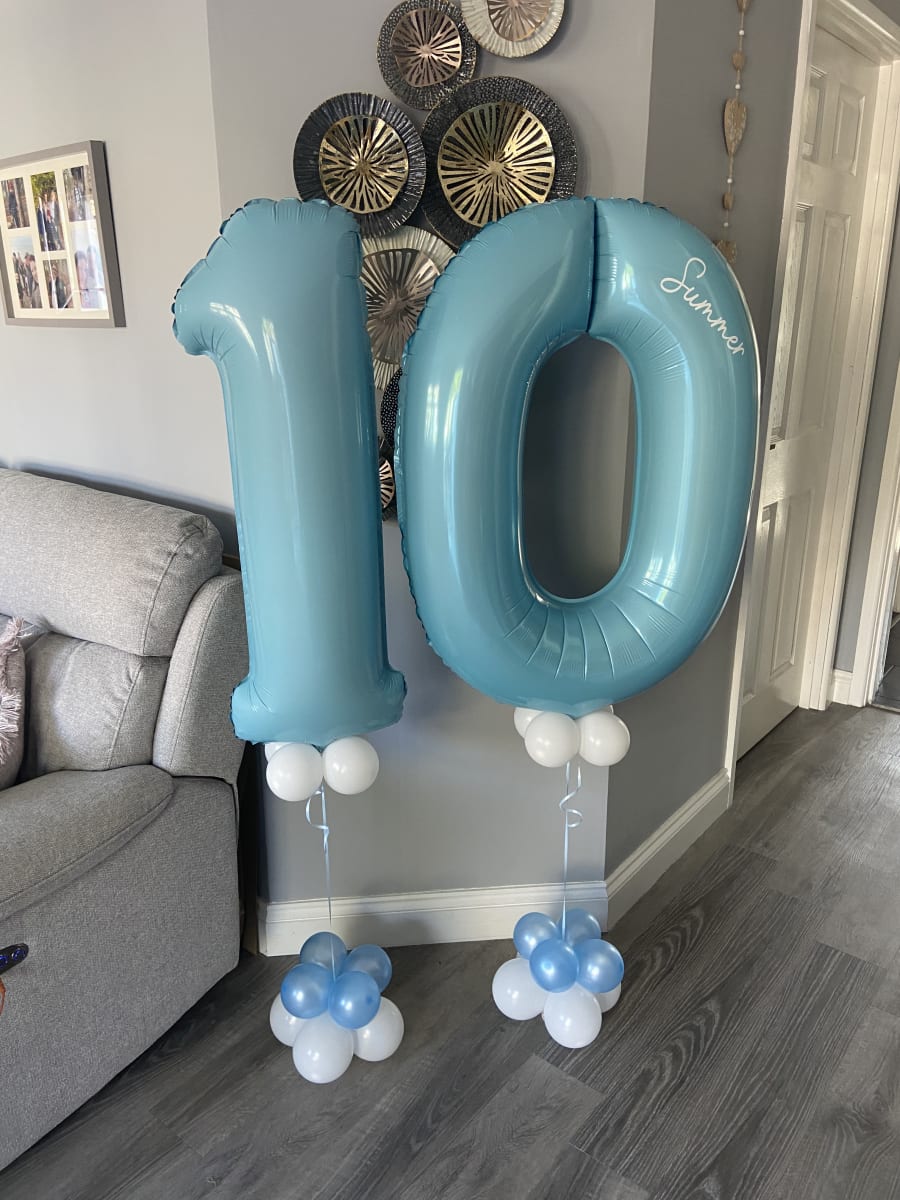 Helium filled numbers of your choice on a small weighted cluster of latex air filled balloons to give it that luxury look.