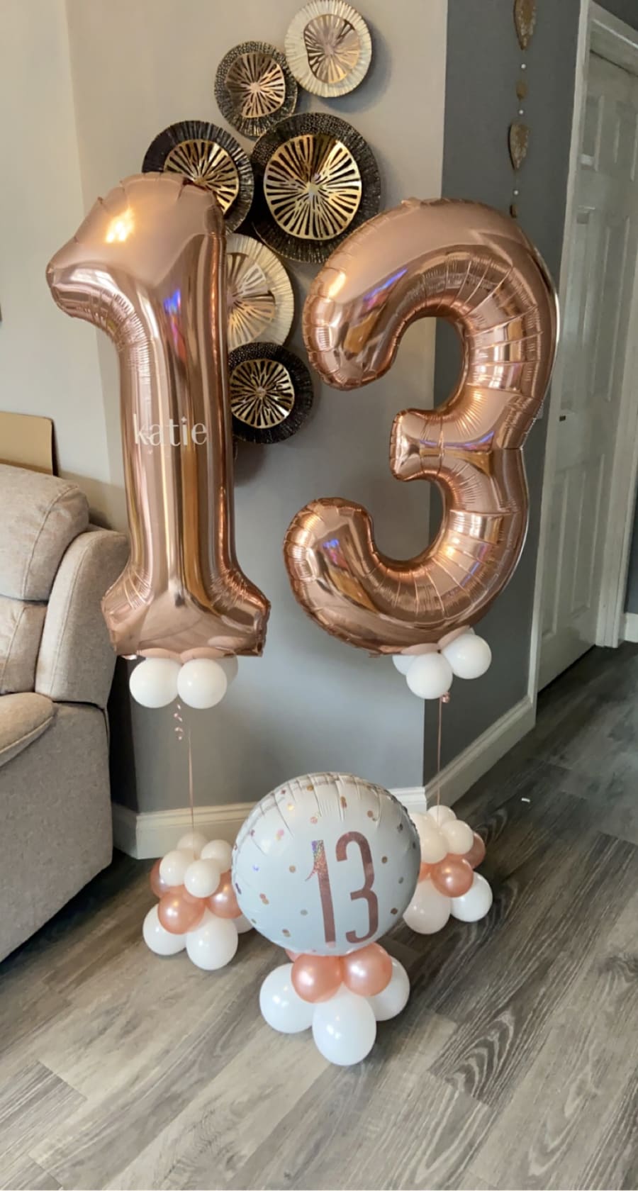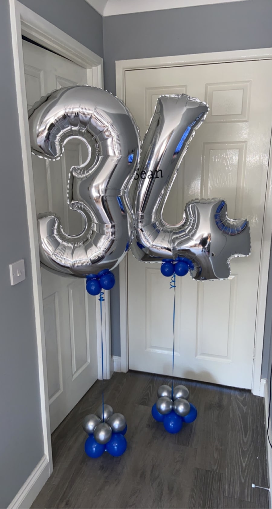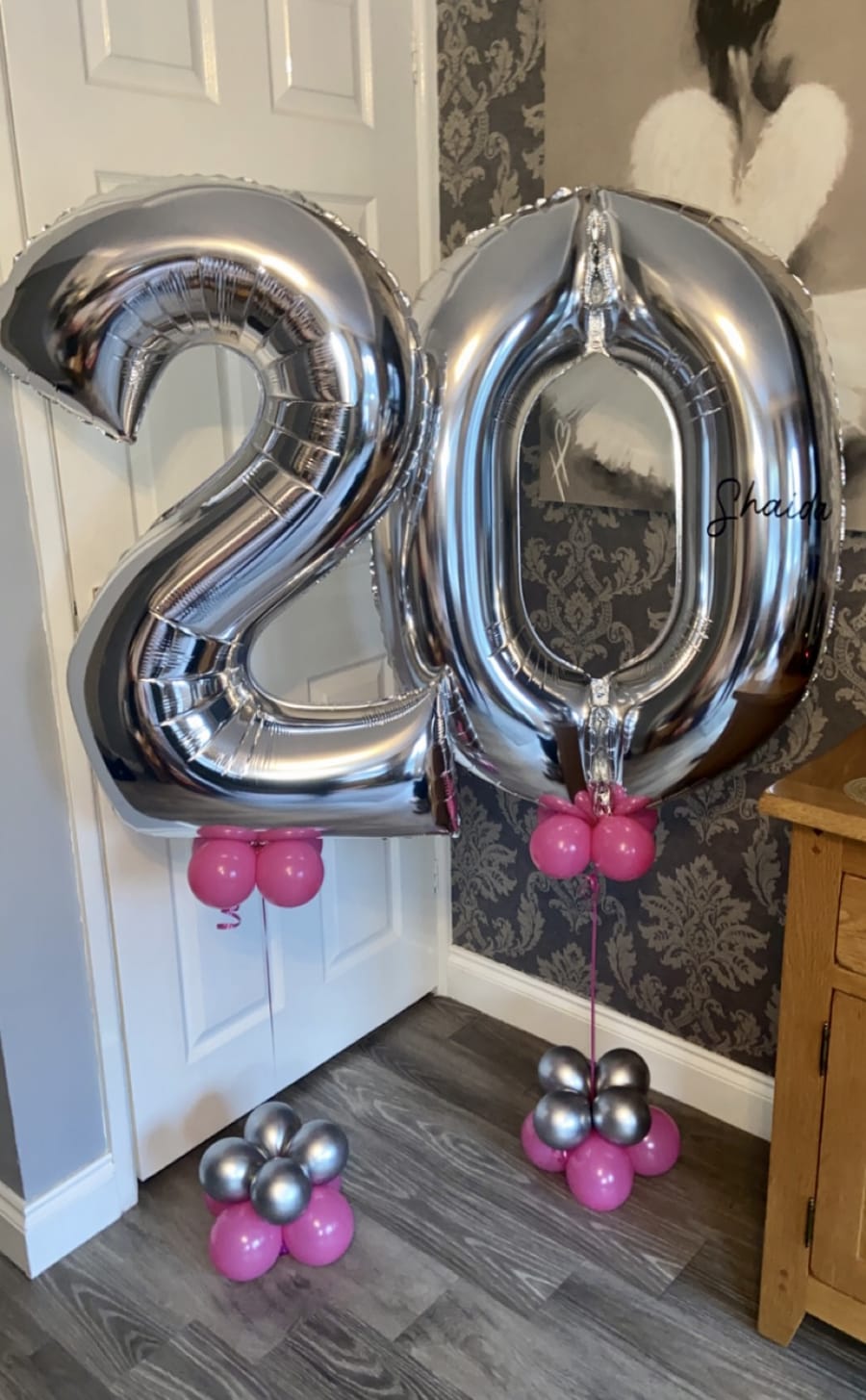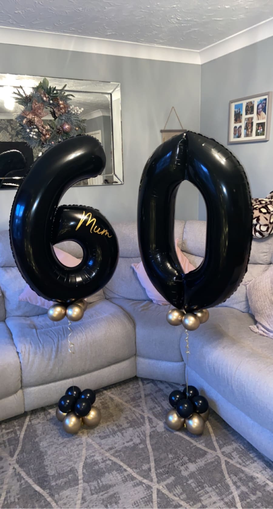 Helium filled numbers of your choice on a small weighted cluster of latex air filled balloons to give it that luxury look.