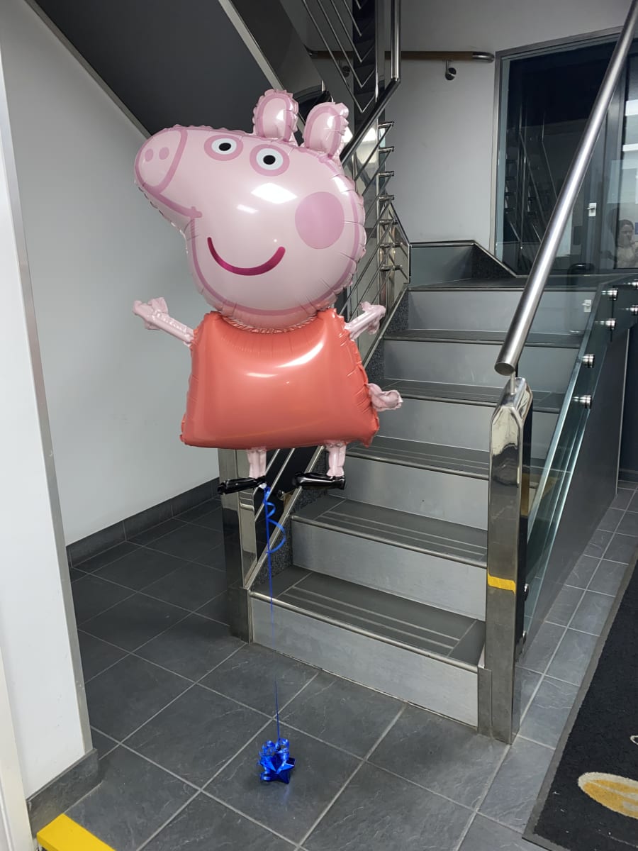 Helium filled Peppa Pig balloon on a small weighted cluster of latex air filled balloons to give it that luxury look. Can be changed to other characters.