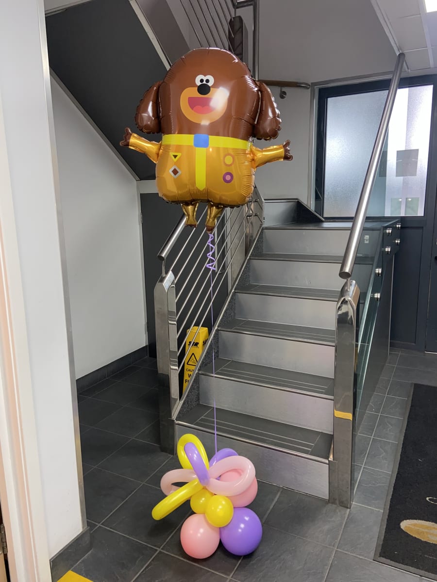 Helium filled Hey Duggee balloon on a small weighted cluster of latex air filled balloons to give it that luxury look. Can be changed to other characters.