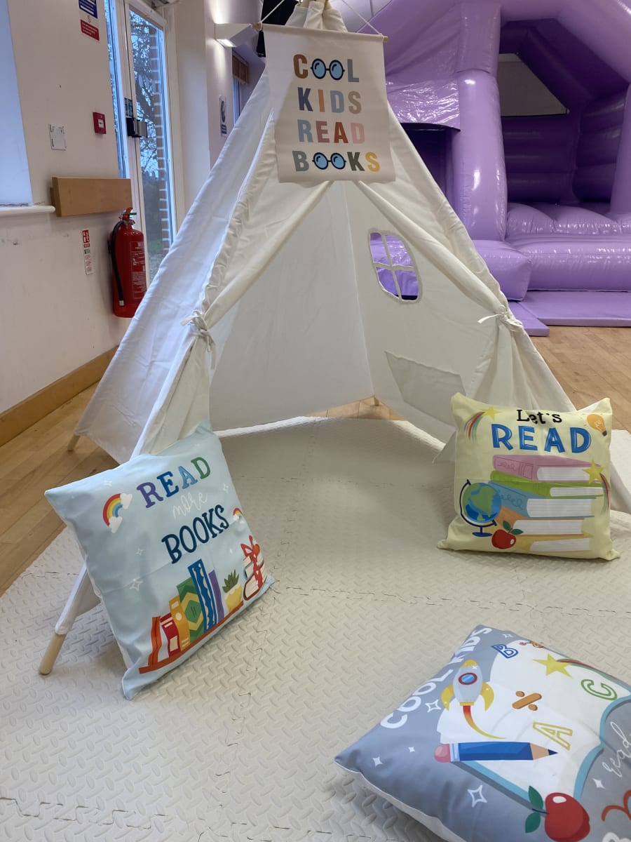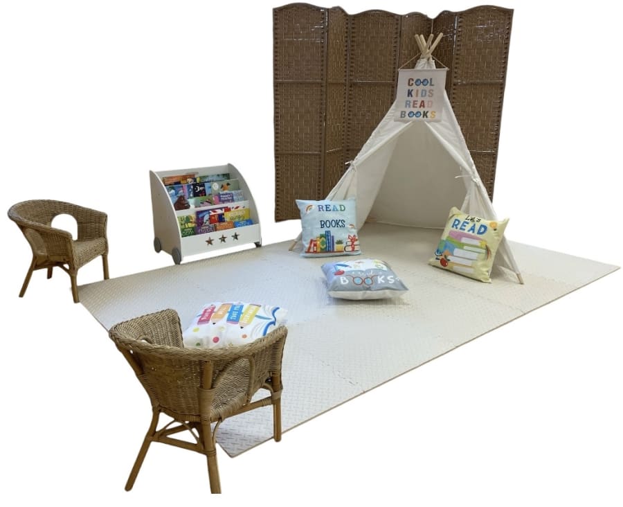 This package is designed to be a gentle, child-friendly space. The teepee offers a fun hideout while the cushions and soft matting keep little readers comfortable. The wicker screen divider helps reduce noise and creates a distinct quiet zone within a busy event. It’s perfect for one-on-one reading, shared storytime, or a small group of calm readers.
