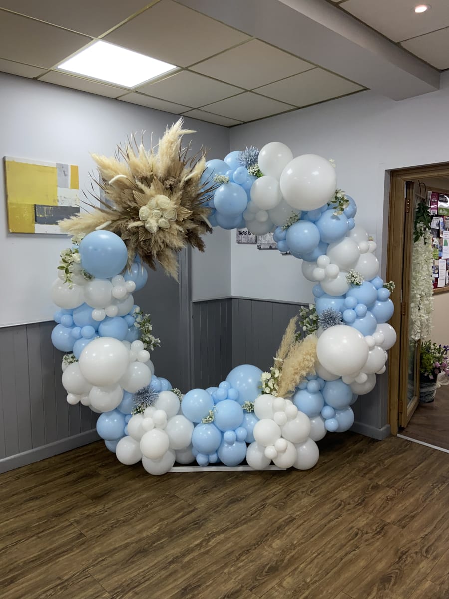 Your choice of a full balloon hoop or a large pampas display added into the hoop