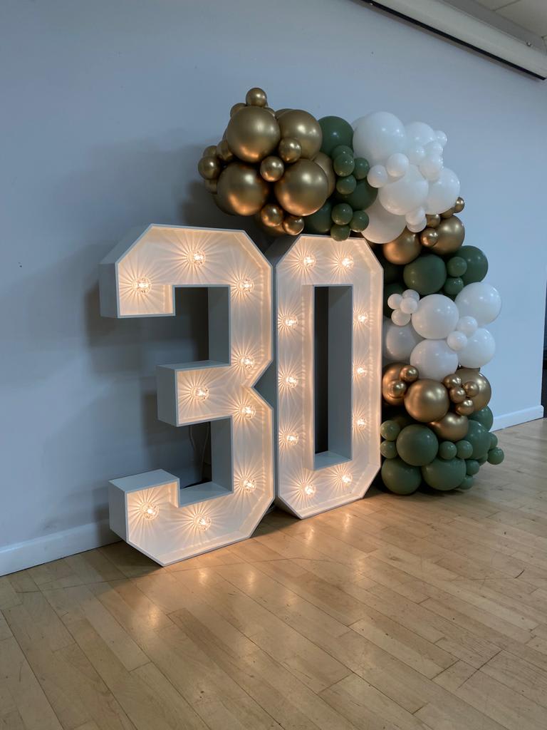 One days hire of 2 x 4ft light up numbers of your choice with balloons cascading up one side of the numbers.